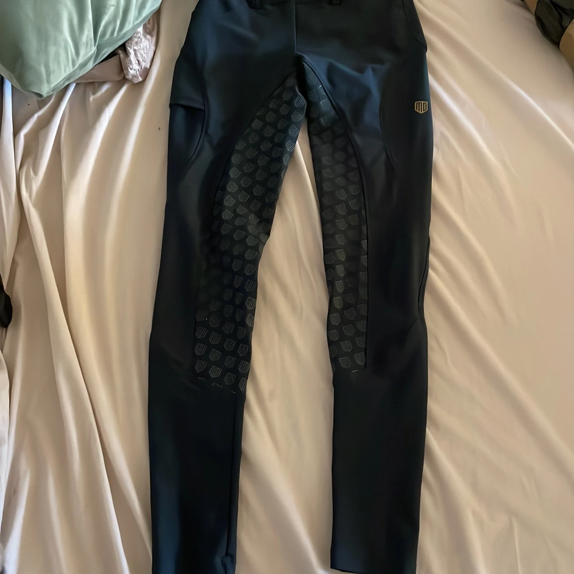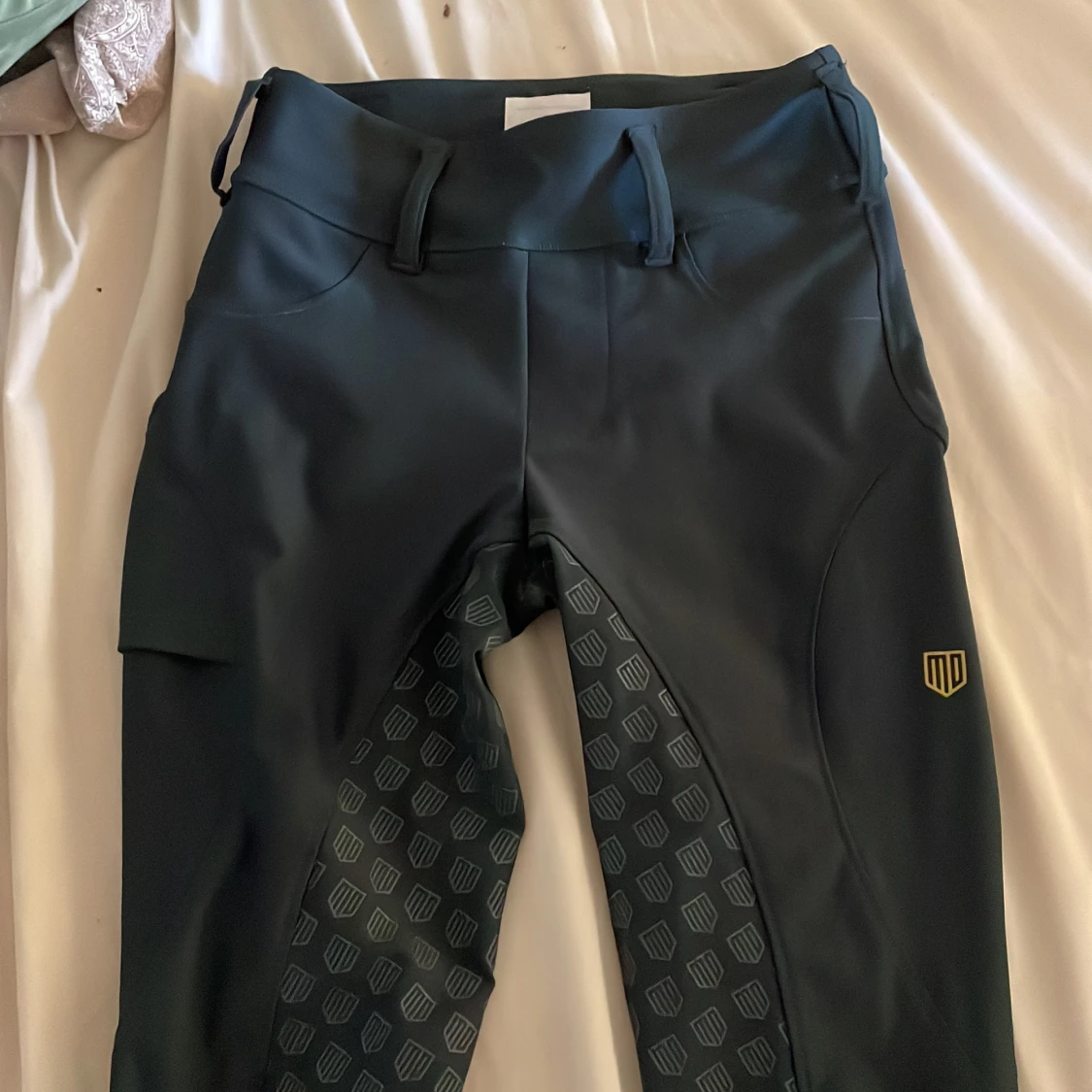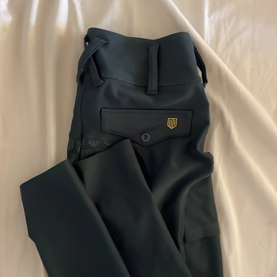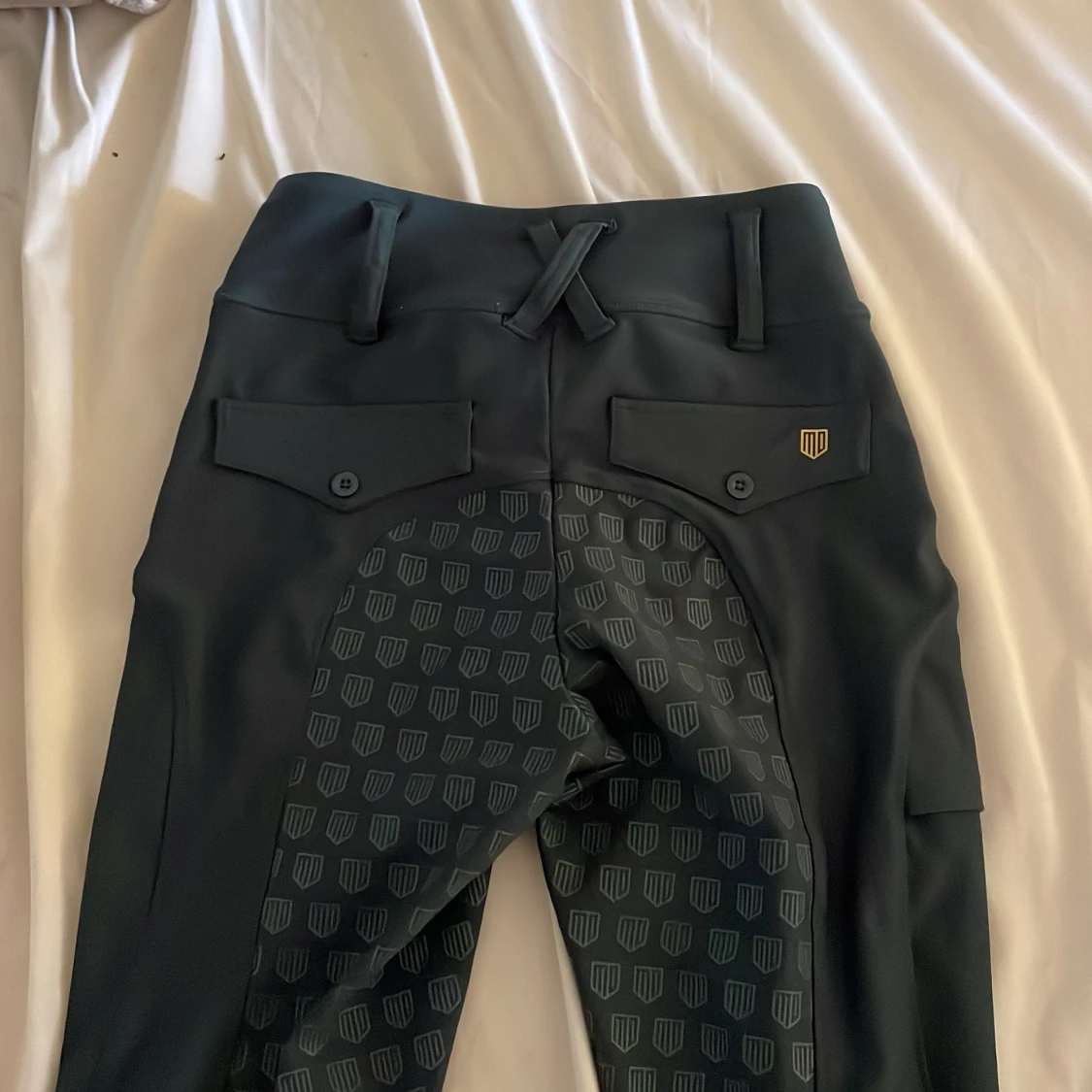 Mörkgröna ridbyxor från Maya delorez med hög midja och helskodd silikonmönster för extra grepp. Byxorna har praktiska fickor med lock och bälteshällor, samt guldfärgad logga på benet och bakfickan. Perfekt passform och stilren look.