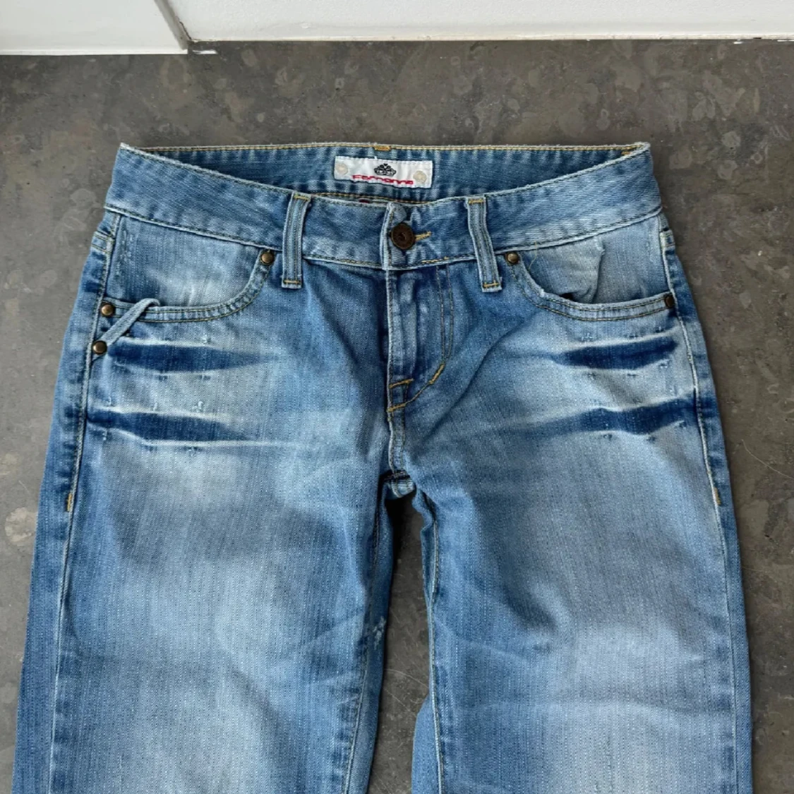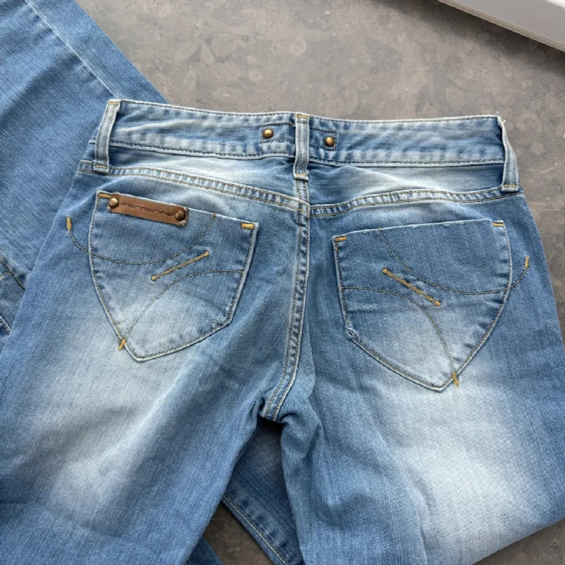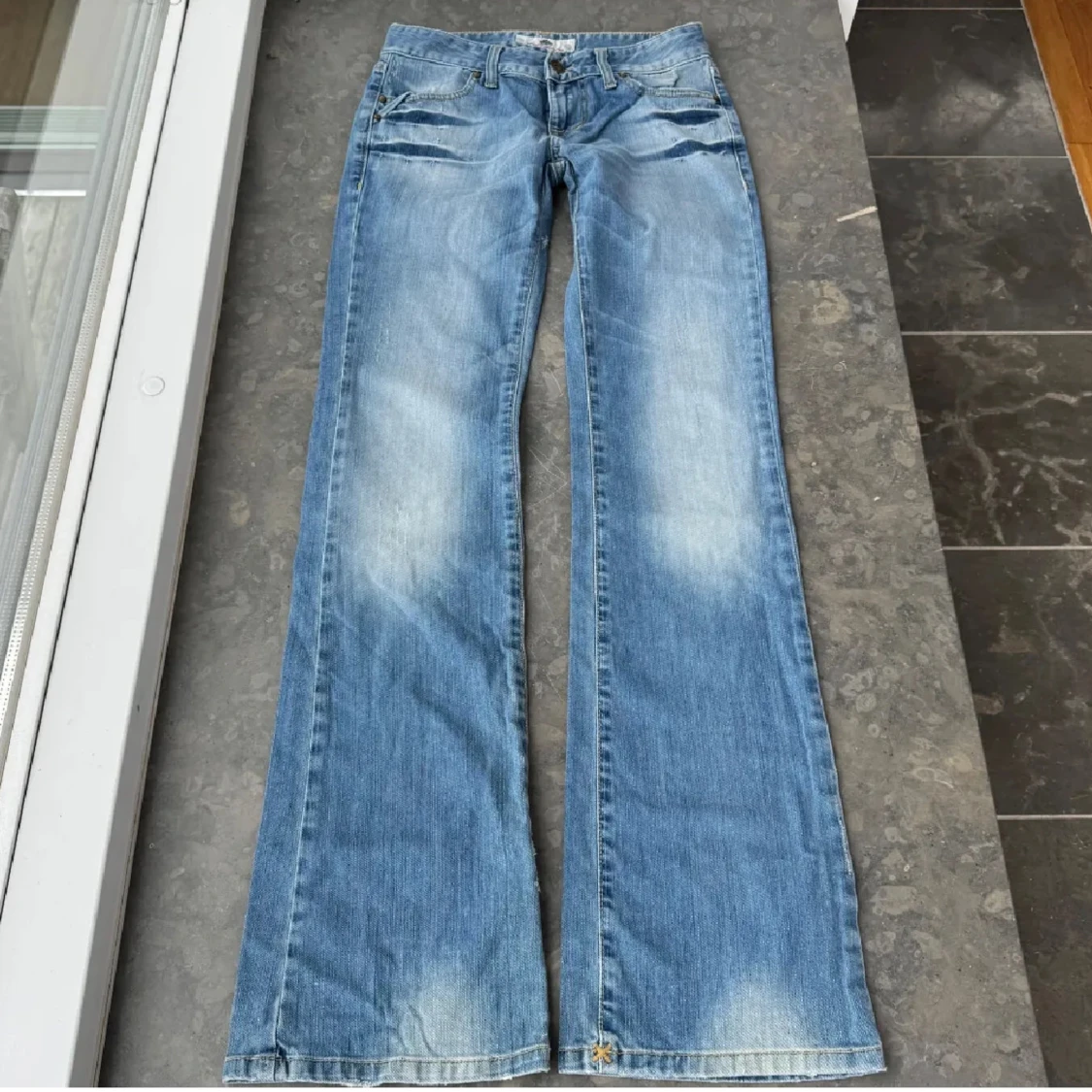 Jättefina utsvängda jeans köpta här på Plick (bilderna är lånade), de var tyvärr för små så de kom aldrig till användning!! Midjemåttet är 37 cm och innerbenslängden är 86 cm. Jättebra skick, finns dock ett pyttelitet hål i låret men som inte syns när man har på de (se sista bilden)💞