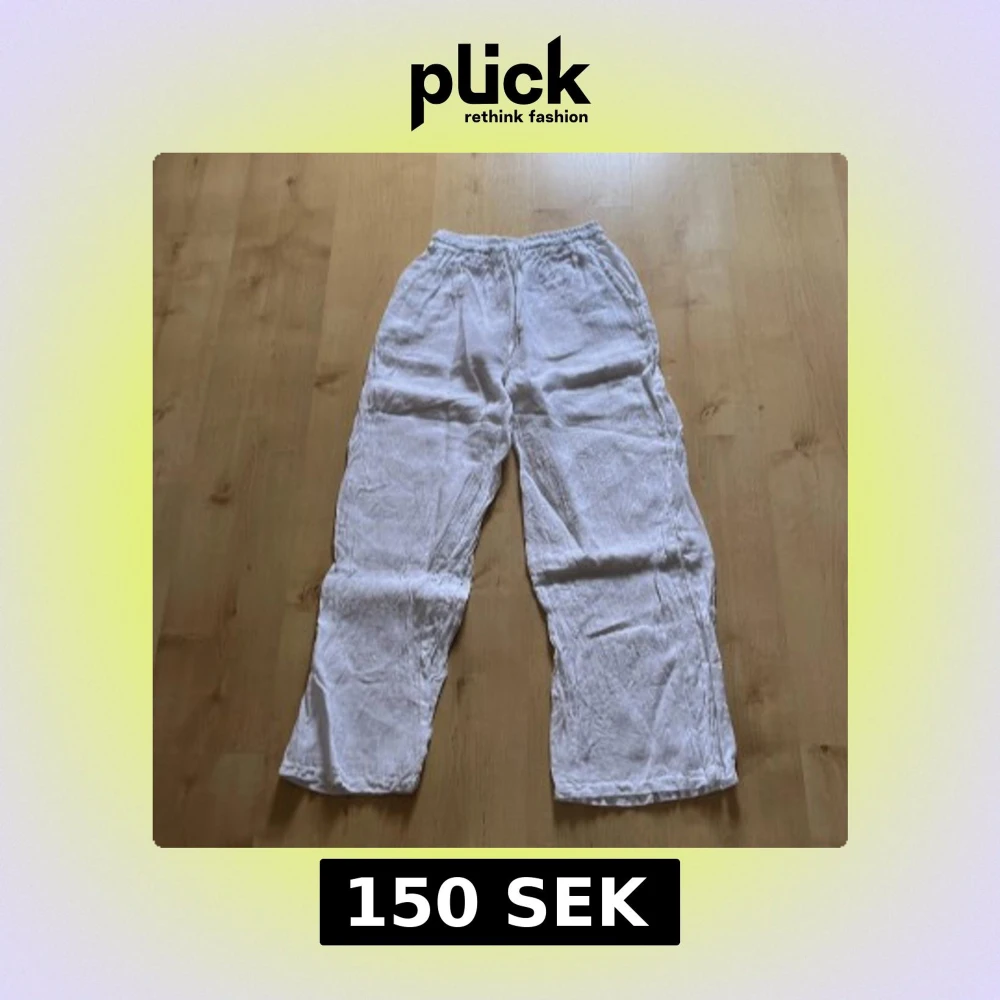 Säljer ett par vita linnebyxor med avslappnad passform och resår i midjan. Perfekta för varma dagar och enkla att matcha med olika toppar. Lätta och luftiga, passar dig som gillar en chill stil.
