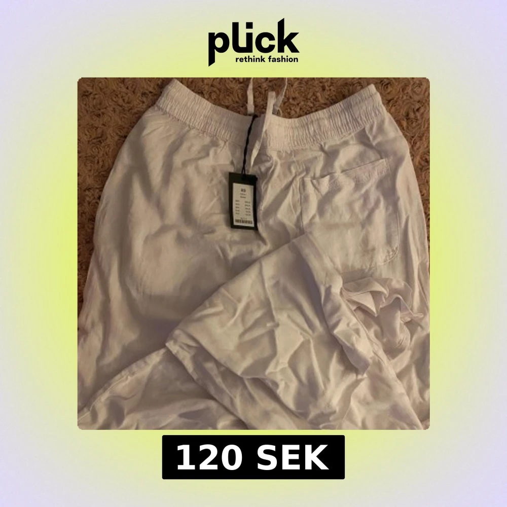 Säljer ett par vita linnebyxor med resår och dragsko i midjan. Byxorna har raka ben och en bakficka. 🥰helt nya!!