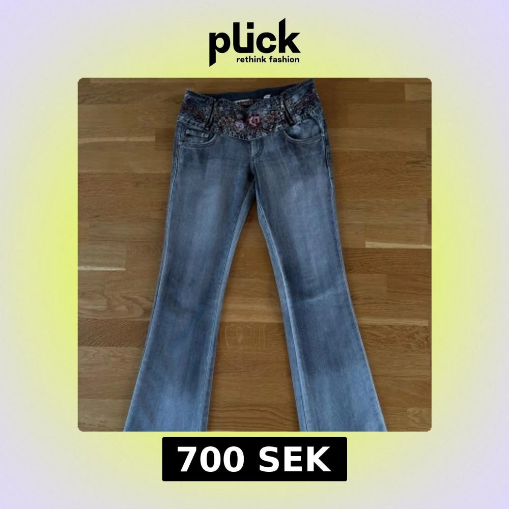 Snygga grå bootcut jeans med detaljerat blommigt broderi på fickor och linning. Perfekta för en unik stil med en touch av vintage. De har en klassisk femficksdesign och en bekväm passform.