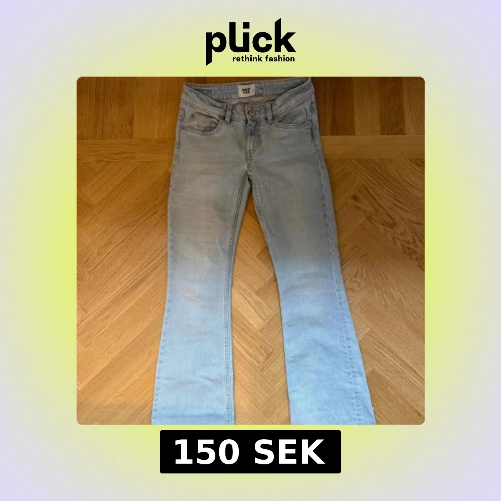 Snygga ljusblå jeans från 157 med bootcut-snitt och låg midja. Klassisk femficksmodell med dragkedja och knapp framtill. Jeansen är tillverkade i mjukt denimtyg och har en stilren, enkel design utan extra detaljer eller mönster.