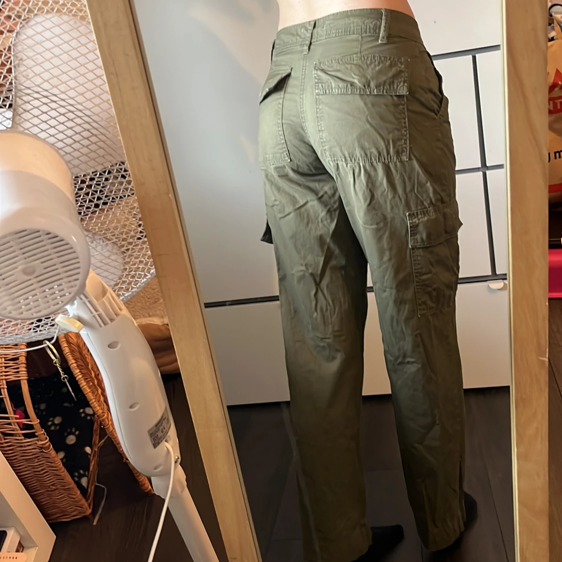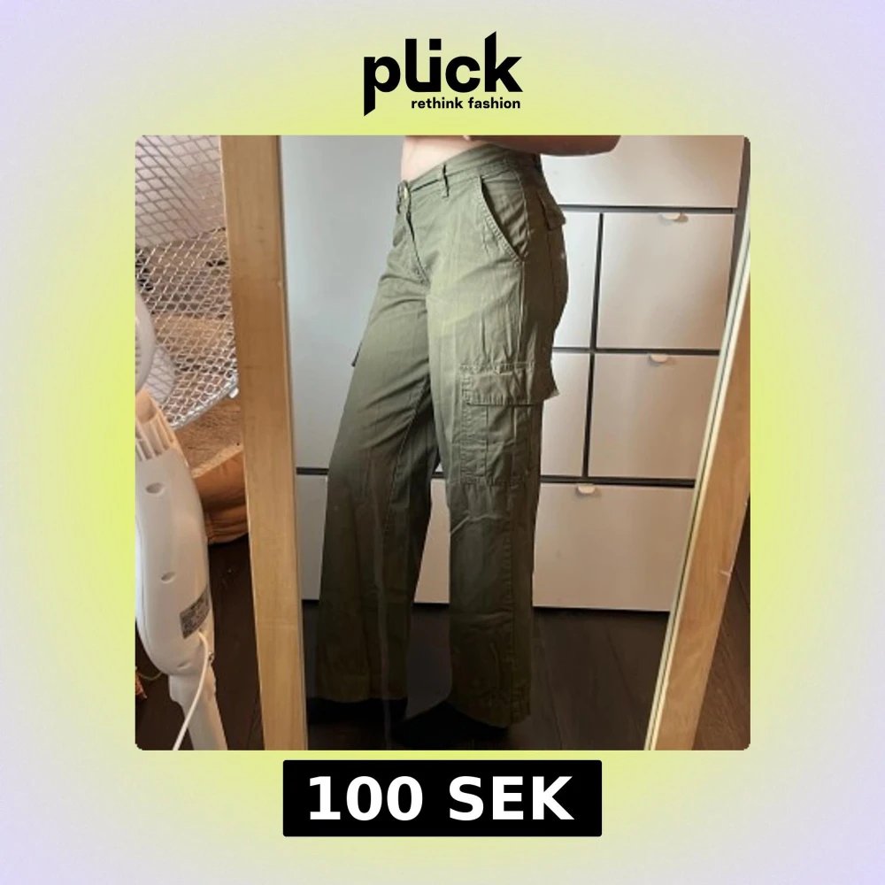 Säljer ett par olivgröna cargopants med raka, lite loose ben och flera praktiska fickor på sidorna och bak. Byxorna har normal midja och är tillverkade i ett mjukt bomullstyg. Använda ett fåtal gånger, superfina! Storlek xs