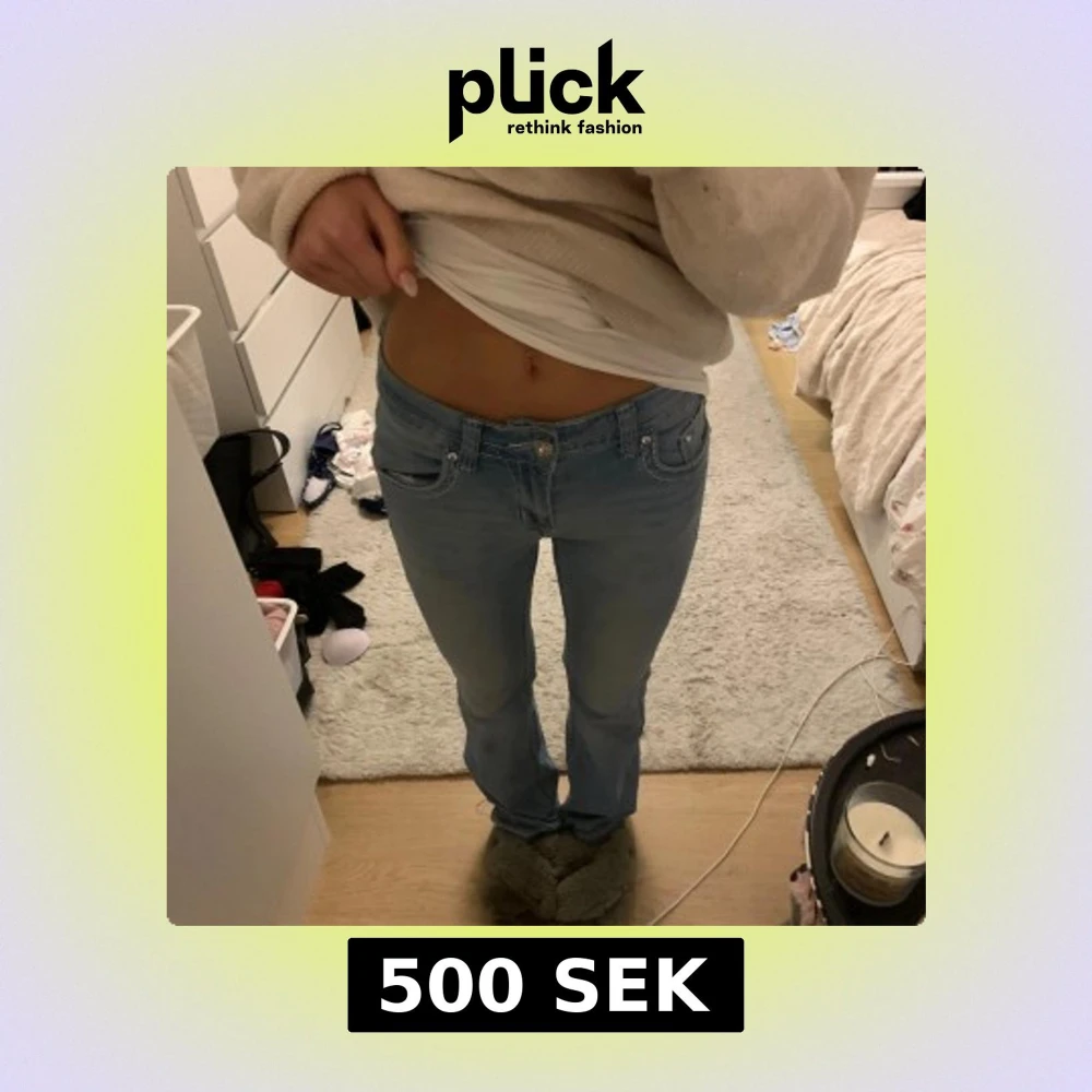 Säljer ett par ljusblå jeans med snygga detaljer och bling på fickorna. Baksidan har en stor korsapplikation med stenar och broderier. Jeansen har låg midja och raka ben, perfekt för dig som gillar statement-plagg.