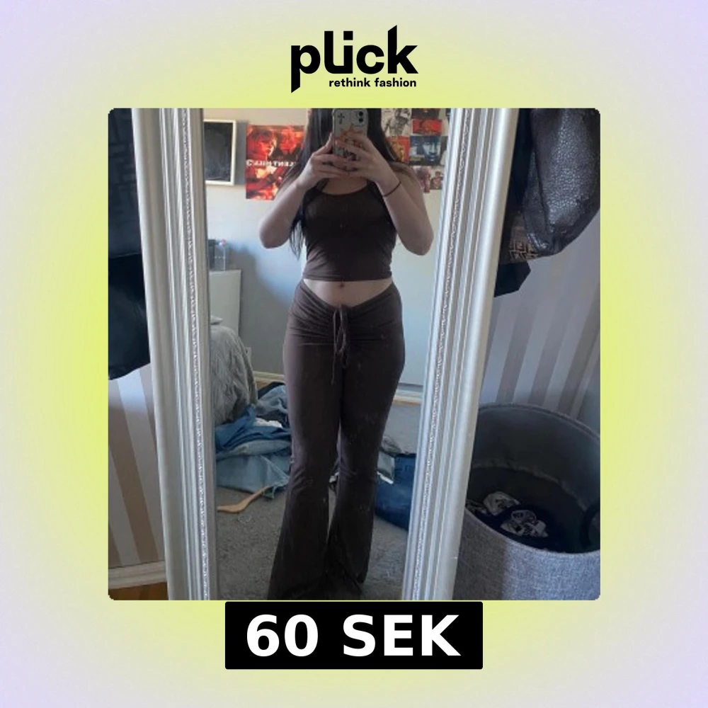Säljer ett brunt ribbat set med croppad linne-topp och matchande byxor. Byxorna har hög midja, dragsko och utsvängda ben. Perfekt för en avslappnad och trendig look.