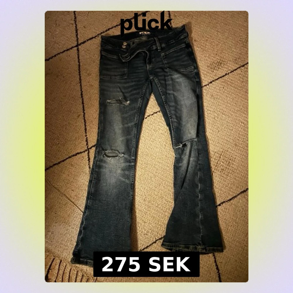 Blå bootcut jeans med slitningar - Säljer ett par ljusblå lågmidjade bootcut jeans från Gina Tricot med snygga slitningar över knäna och klassiska fem fickor. En julklapp som tyvärr inte passade💕