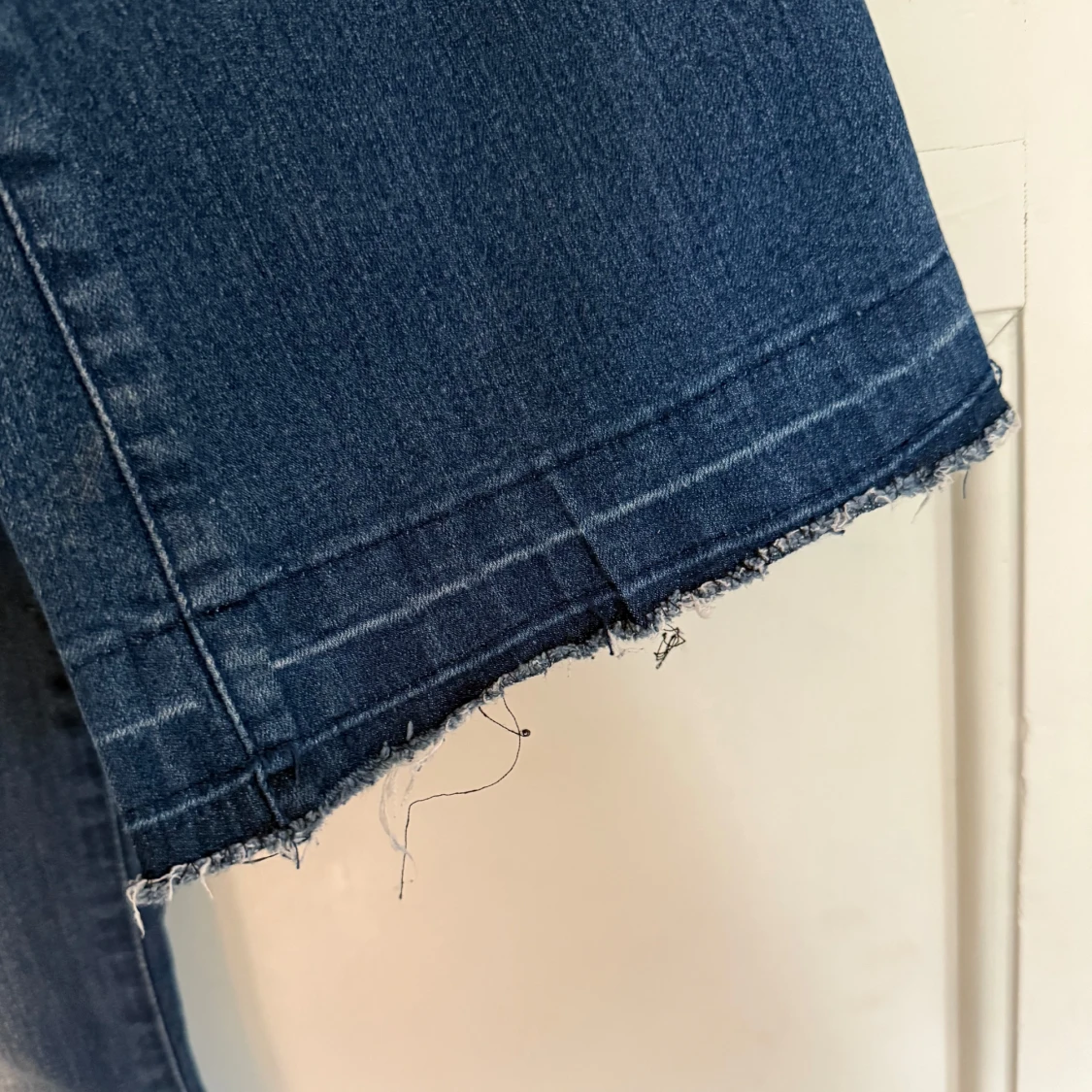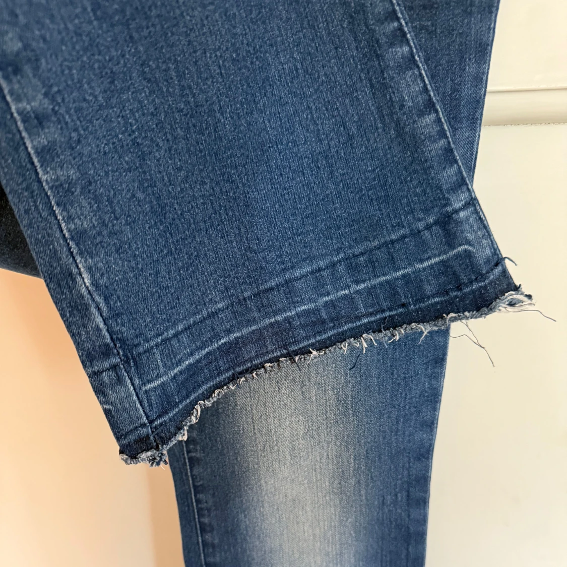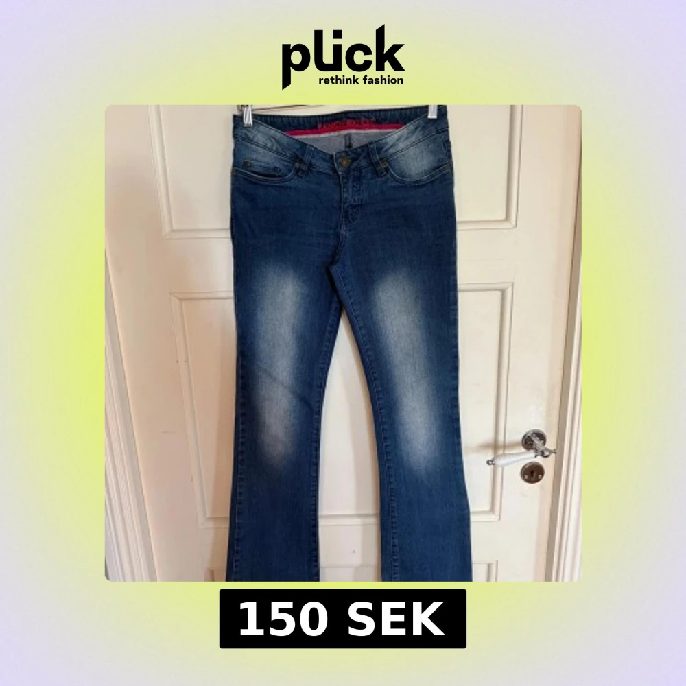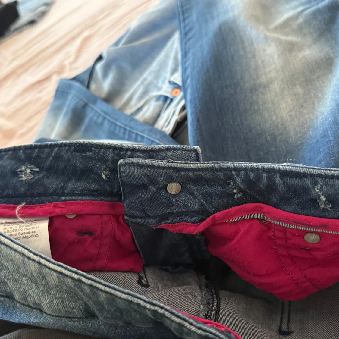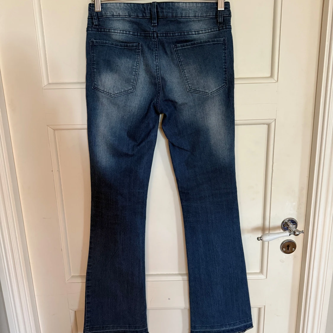 Köpta second hand, någon har lagt ner jeansen så de har blivit längre (Bild 3&4). Och hål på insidan för att reglera midjans storlek, men det är inget som påverkar funktionen alls. Midjemått: 39,5 cm rakt över. Innerbenslängd: 81 cm.