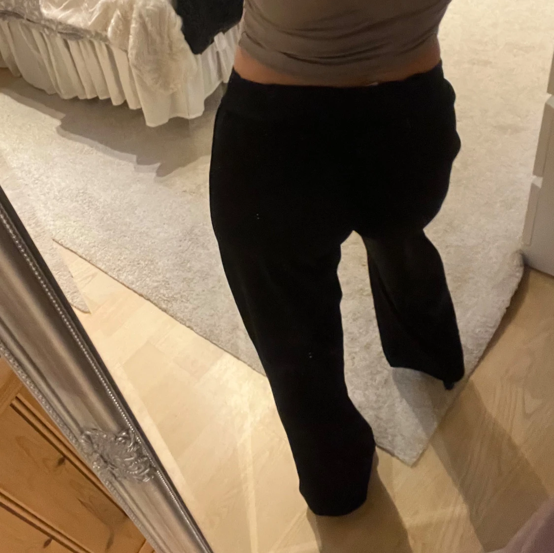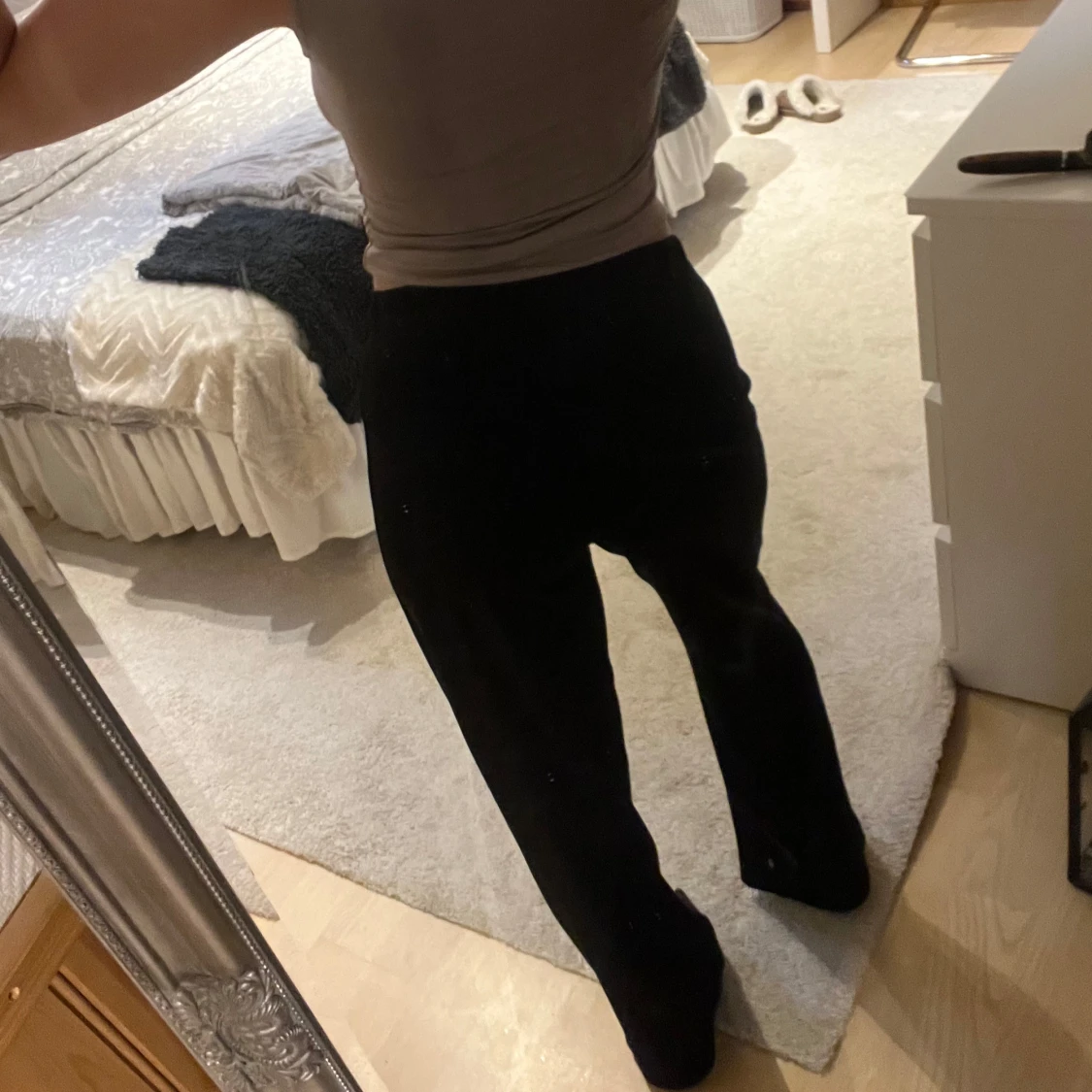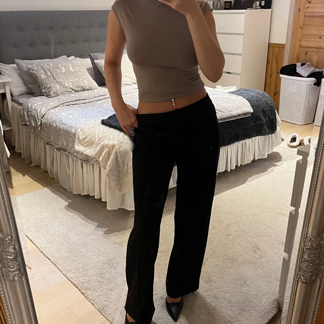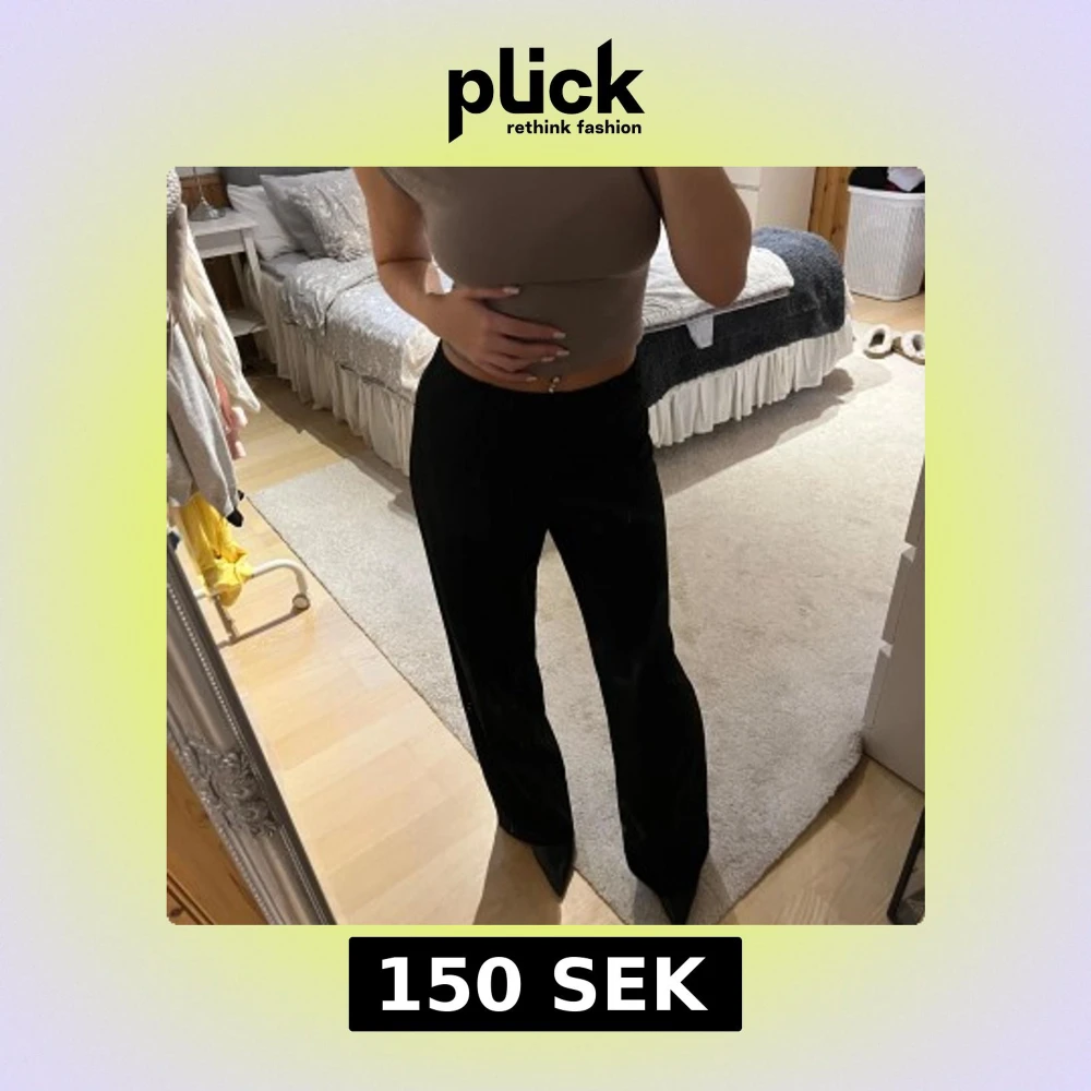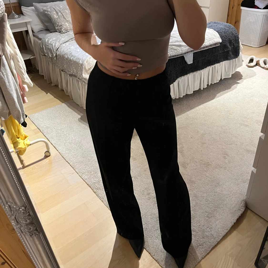 Säljer ett par svarta kostymbyxor med raka ben. Byxorna har klassisk look med en söm som följer benen och är perfekta om du gillar en loose och avslappnad stil. Materialet känns mjukt och följsamt, passar till sneakers eller klackar. Storlek xs och är liite långa för mig som är 153 men går att vika ner i midjan om man vill. Tyvärr har byxorna ett litet märke på baksidan på ett av benen men det syns knappt, kan skicka bild vid efterfrågan🌸