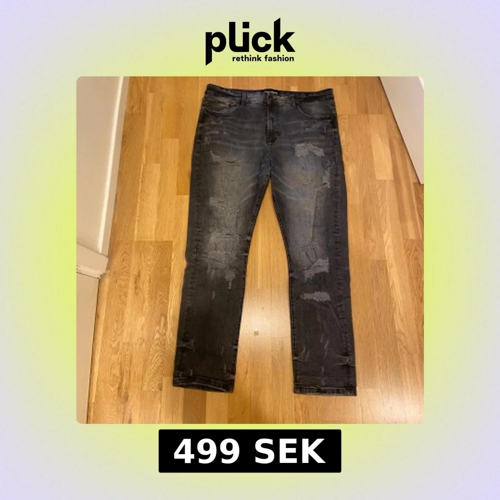 Säljer Svarta jeans från Supply & Demand med slitna detaljer Modellen har klassiska fem fickor och en extra dragkedja vid ena fickan. XXL i storlek, hör av vid minsta lilla fråga. Äkta såklart :)
