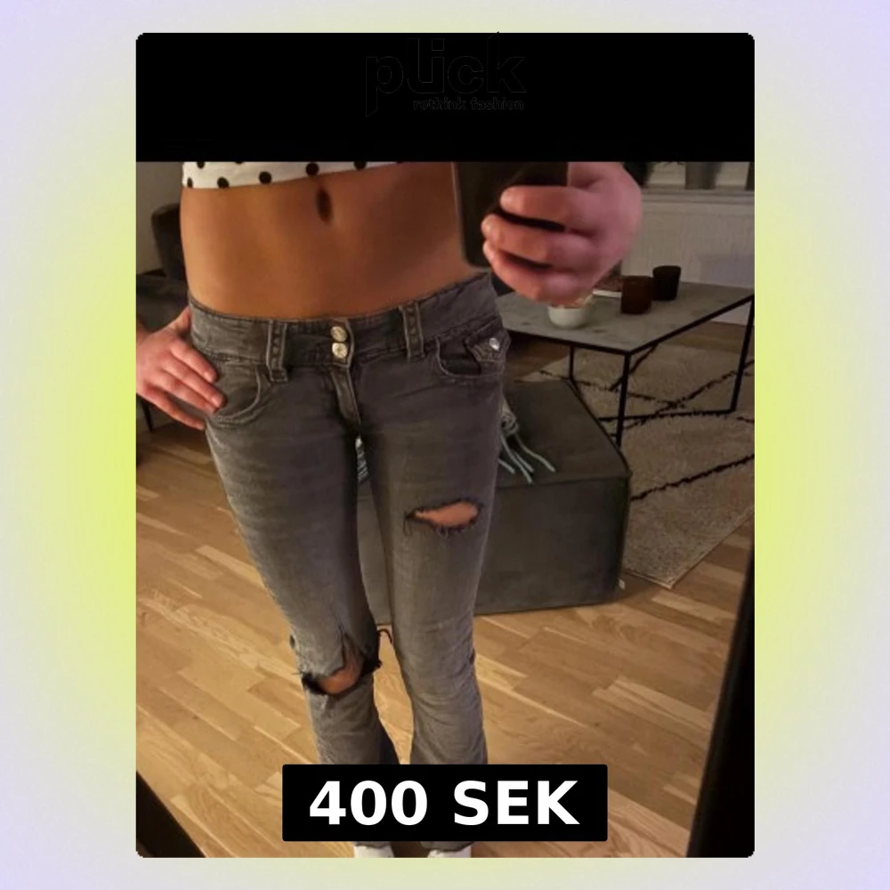 Säljer ett par grå jeans med bootcut-modell och låg midja. Jeansen har slitna detaljer och stora hål vid knäna, priset är diskuterbart💓
