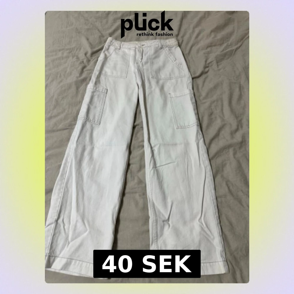 Säljer ett par vita cargopants med raka ben och stora fickor på sidorna. Byxorna har mid midja och är tillverkade i ett kraftigare bomullstyg. Snygga kontrastsömmar och klassisk cargostil som passar till många olika looks.