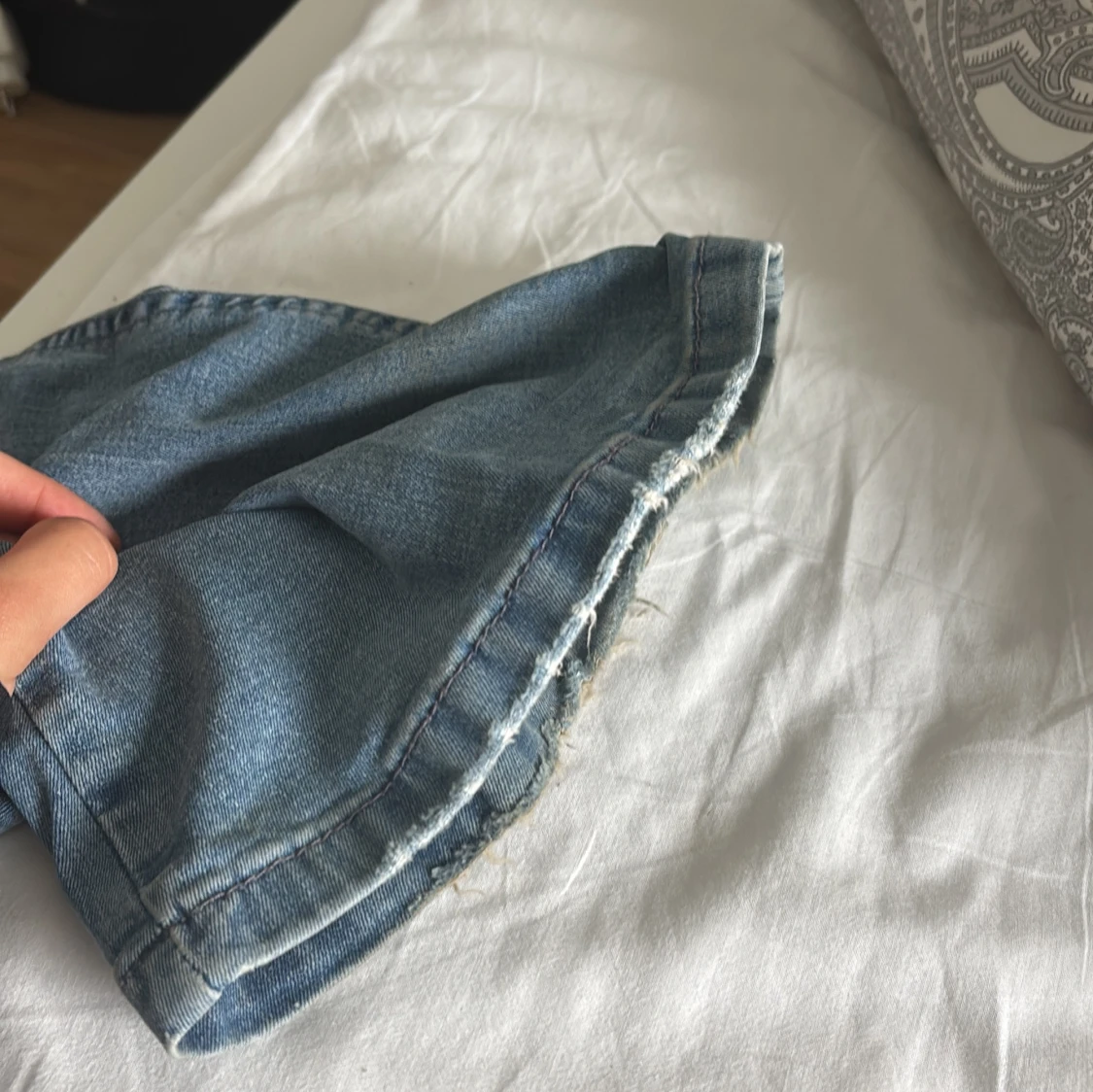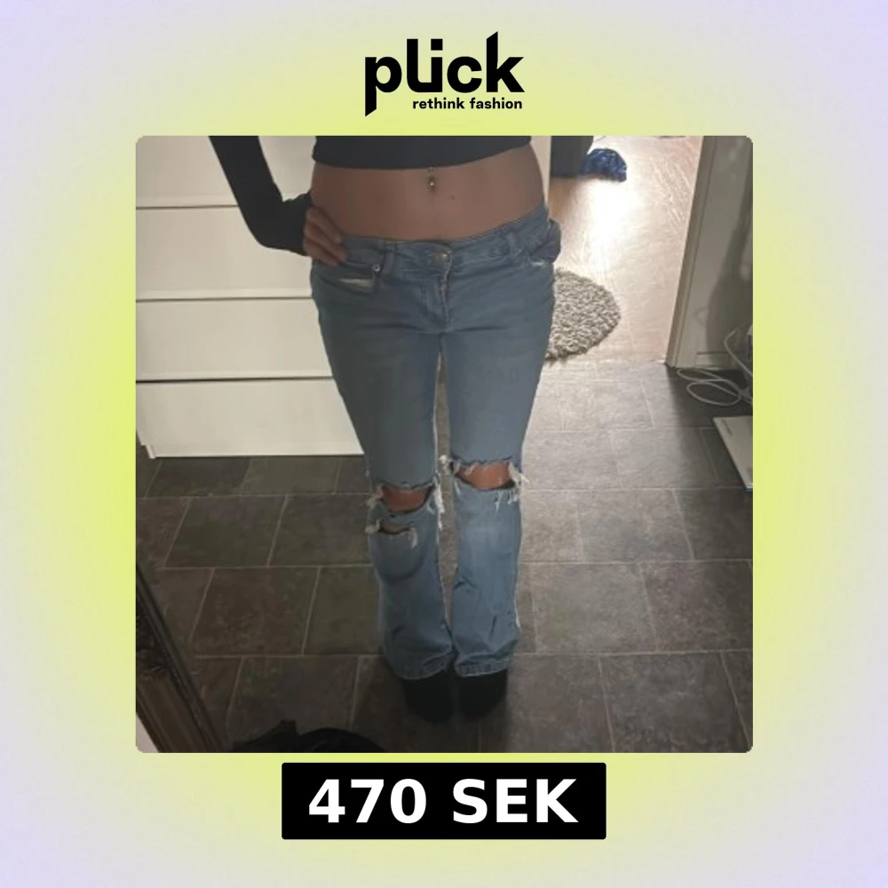 Säljer ett par ljusblå jeans med bootcut-modell och snygga slitningar över knäna. Lite slitna längst ner.Xxs/xs.