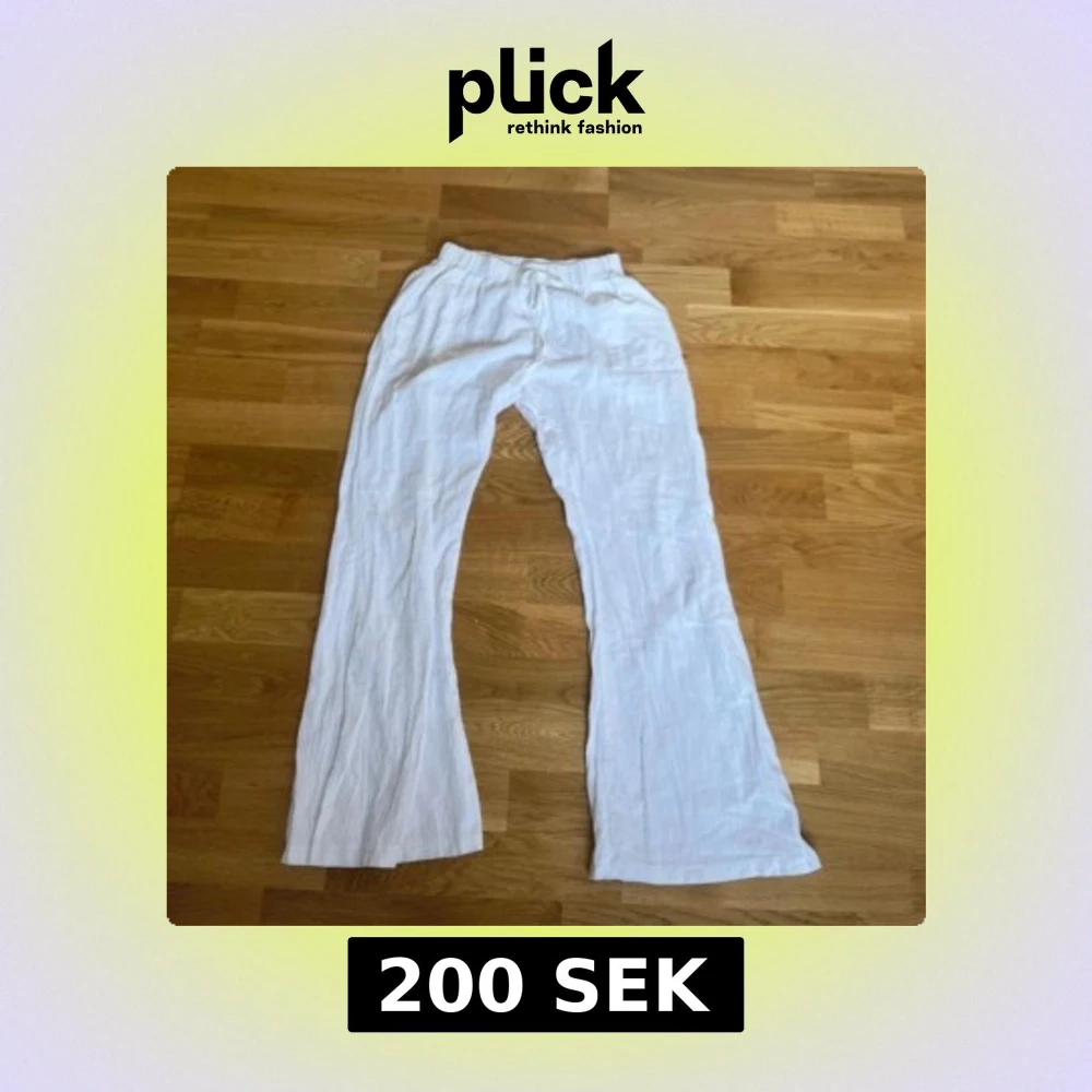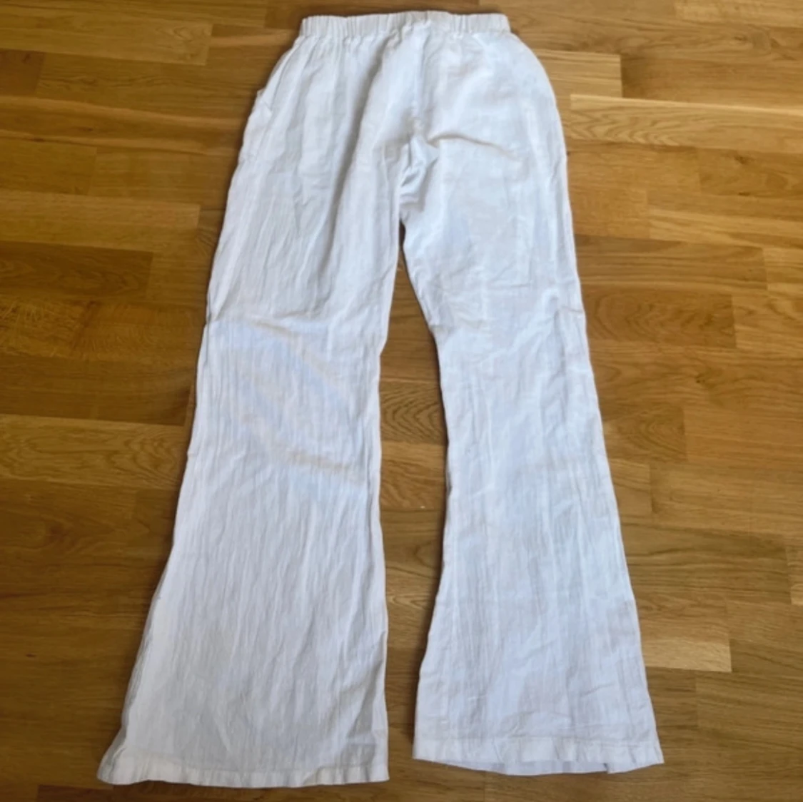 Snygga vita linnebyxor med en avslappnad passform. Byxorna har en elastisk midja för extra komfort och är perfekta för varma dagar. Står varken storlek eller vart de är ifrån då lappen var bortklippt när jag fick de av min kompis, tror de passar någon kring 150 cm