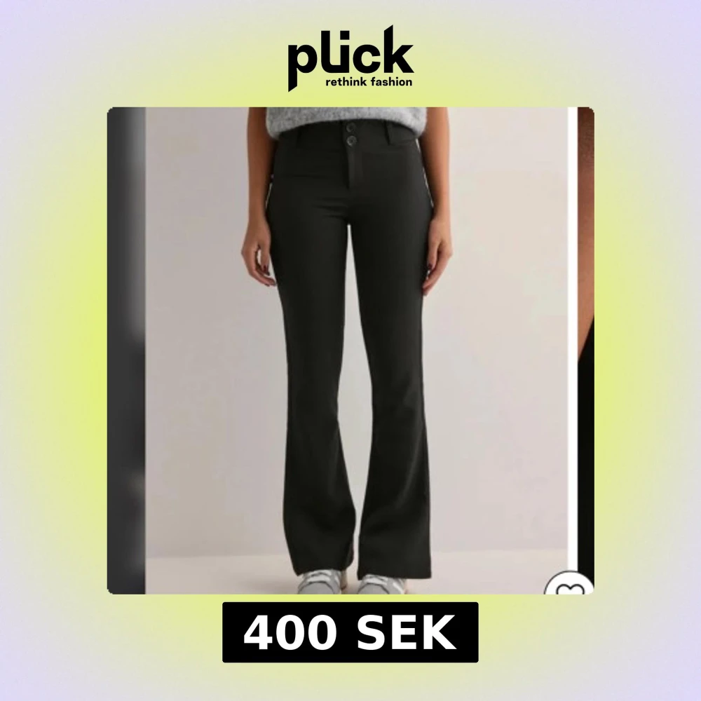 Snygga svarta kostymbyxor med bootcut passform och låg midja. Byxorna har två knappar och dragkedja framtill samt fickor med lock bak. Perfekta för en stilren look. Knappt använda!
