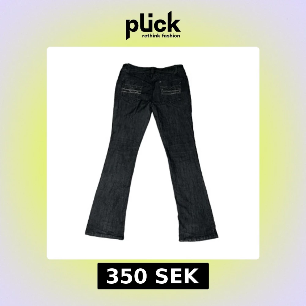 Svarta/mörkgrå lågmidjade bootcut jeans med bling på både framsida & baksida! Bra skick för att vara secondhand. Midjemått tvärs över: 37cm & Innerbenslängd: 79cm