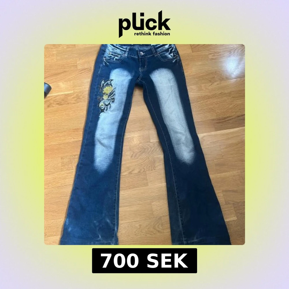 Unika blå jeansbyxor med broderade och glittriga detaljer i gult och svart på både fram- och bakfickor. Byxorna har bootcut-modell och tydliga slitningar framtill för en cool look. Perfekta för dig som vill sticka ut.