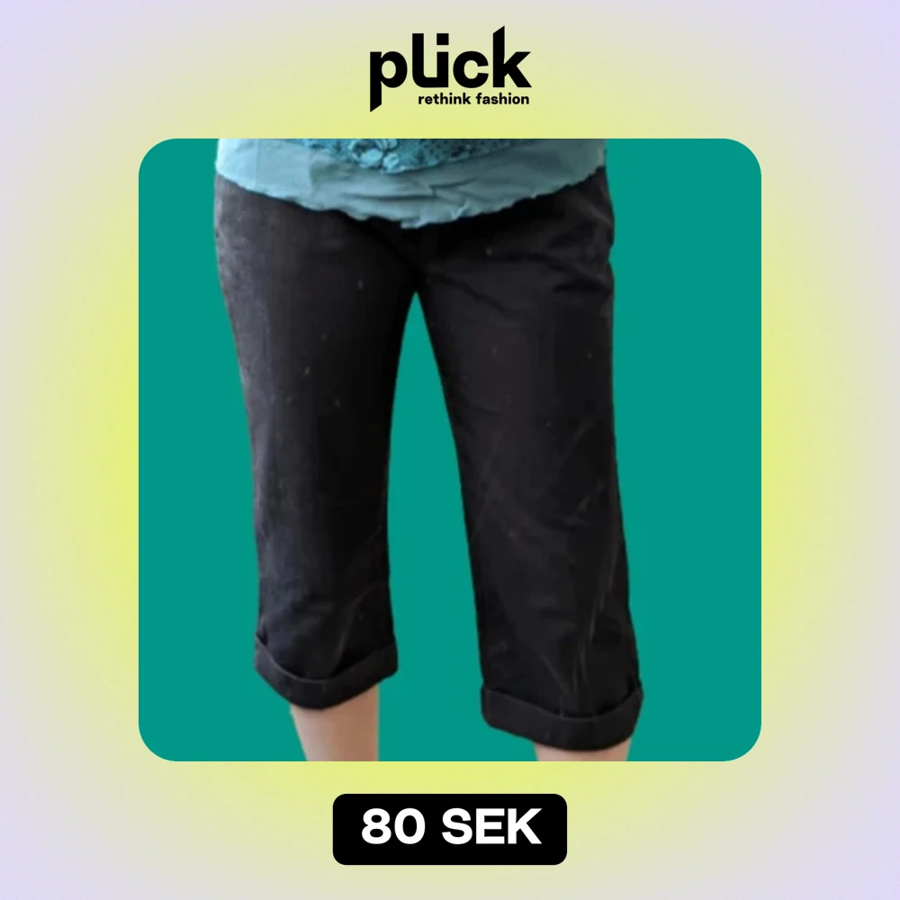 Svarta capribyxor med diamantknapp och -detaljer i strl. 40. De är lågmidjade, typiskt Y2K. Superfint skick, köpta second hand. De täcker knäna och en del av vaden på mig som är 167 cm. Säljer då de är för stora!