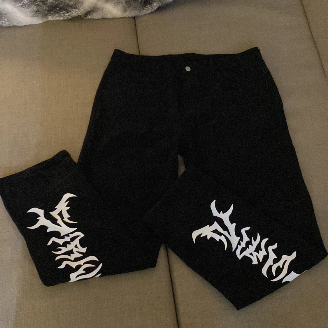 Säljer mina svarta baggy jeans med ett fantastiskt skick och fina vita mönster på baksidan av benen. Dem är väldigt stora vid midjan så rekommenderar ett bälte, jag har kanske inte svar på alla frågor ni vill ställa men det är bara att fråga!