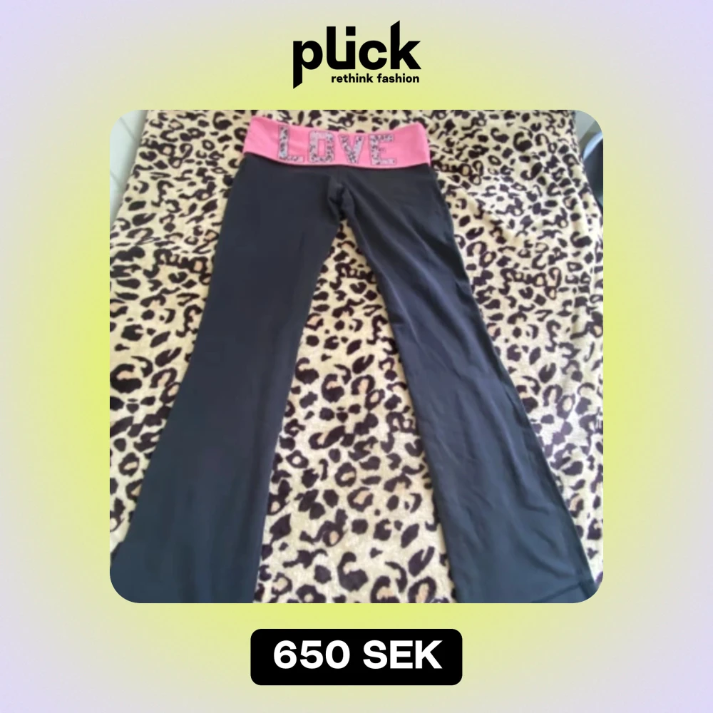 Lågmidjade flare fold over yogapants liknande victoria secret. Hål på insida lår och trycket är slitet men snygga endå. Passar mig som är S men passar även xs.