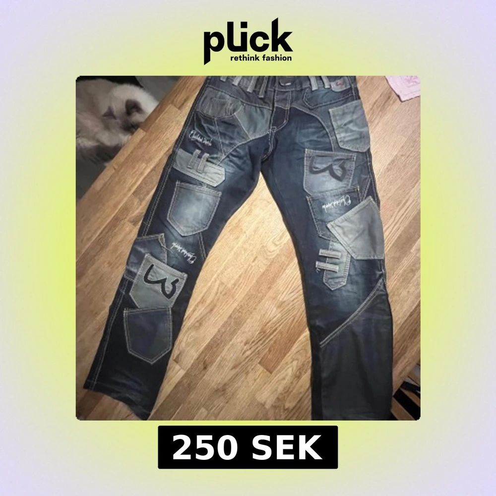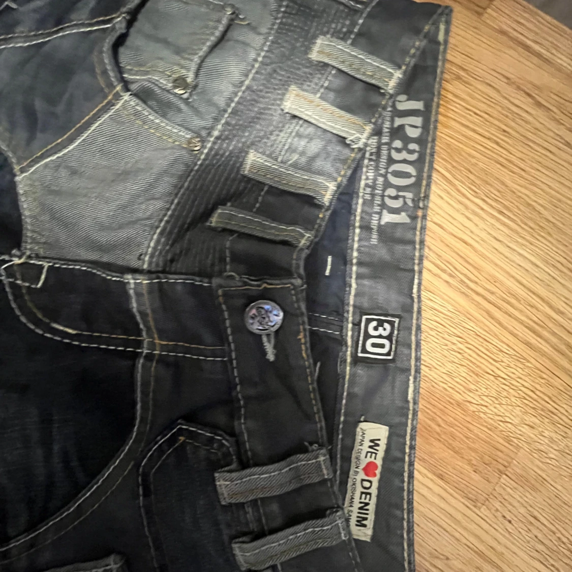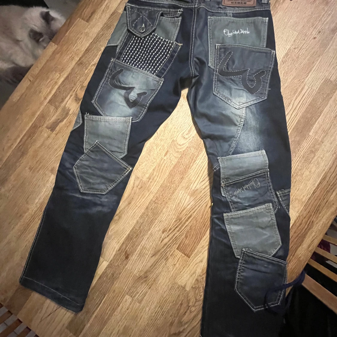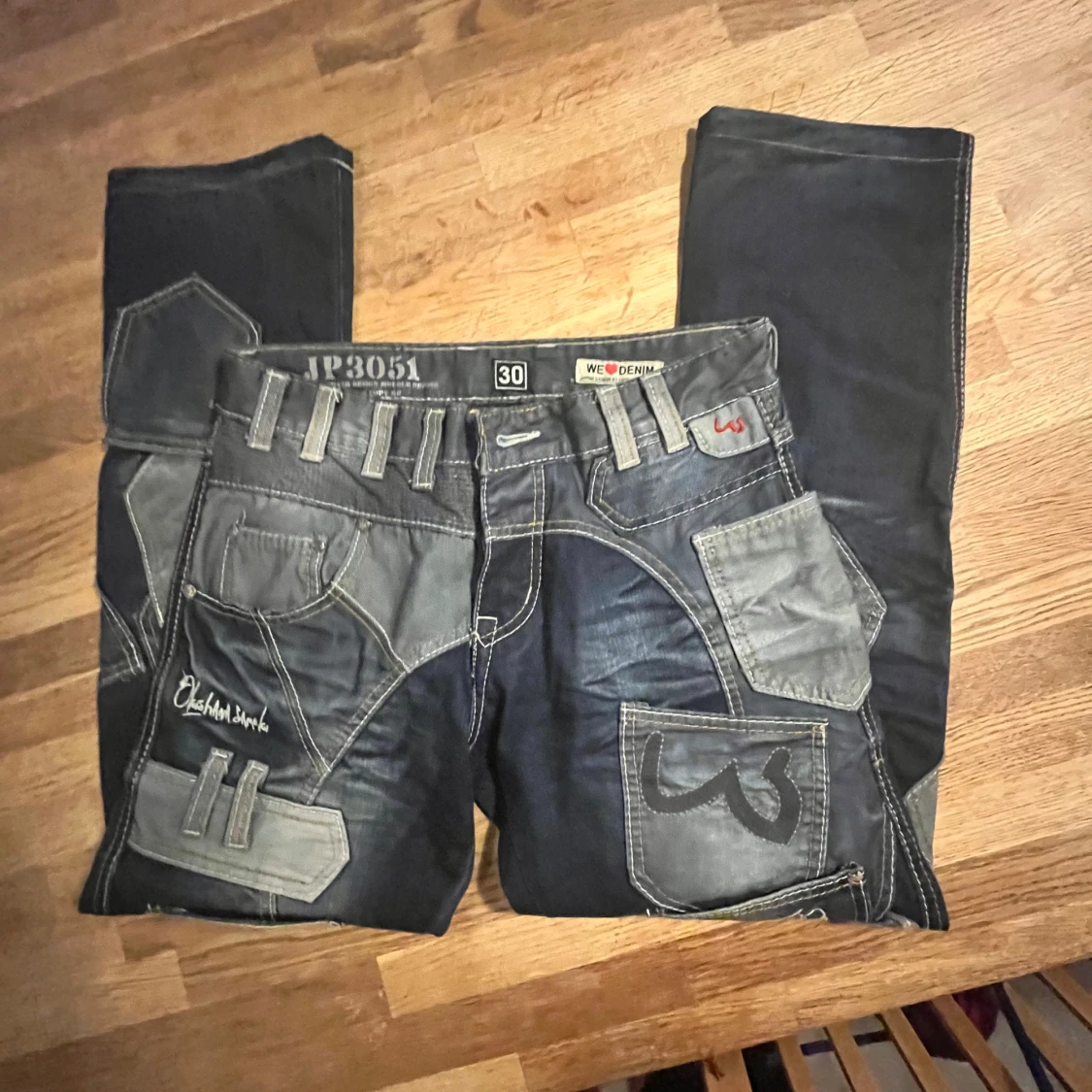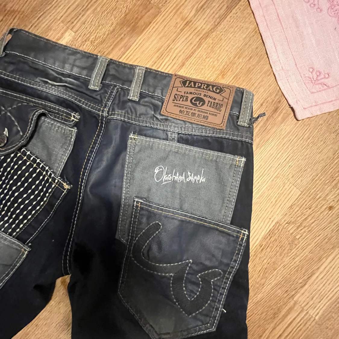 Unika mörkblå denim jeans från Japrag med gråa patchwork-detaljer och broderade fickor. Snygga kontrastsömmar, flera fickor och coola applikationer ger ett streetwear-inspirerat uttryck. Perfekta för dig som vill sticka ut med din stil. 41cm bredd, 99cm längd