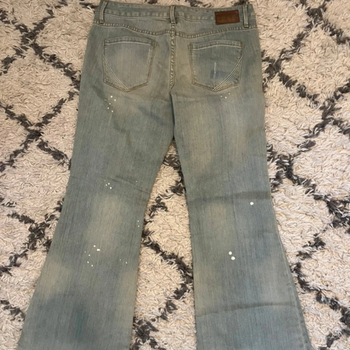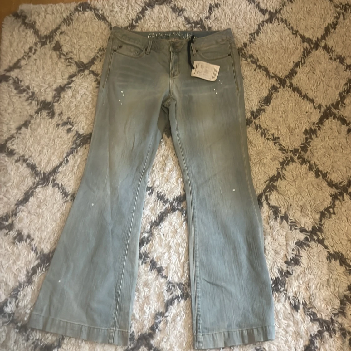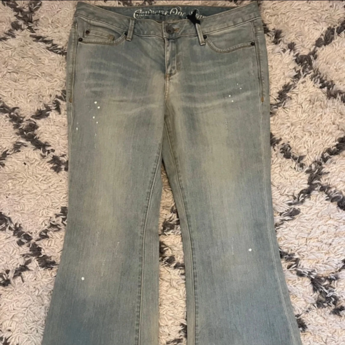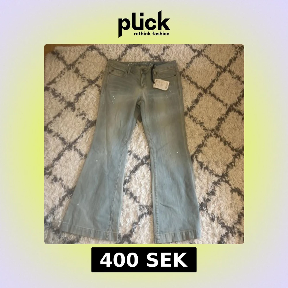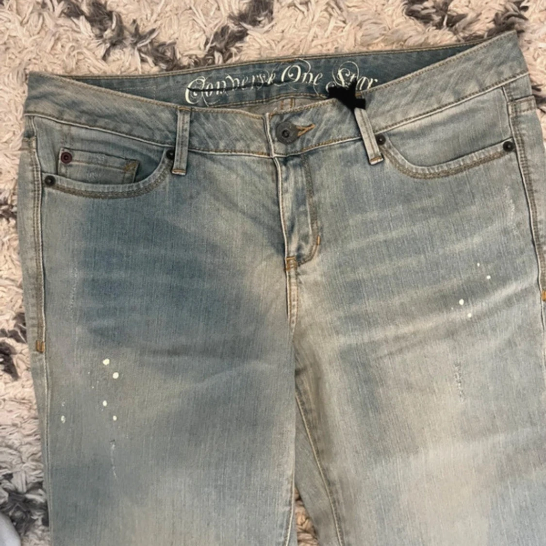 Ljusblå bootcut jeans med unika detaljer ifrån converse one star. Ny med prislapp, lite slitningar vid benänden som är del av designen. Midjemått: 43 cm. Innerbenslängd: 80 cm.