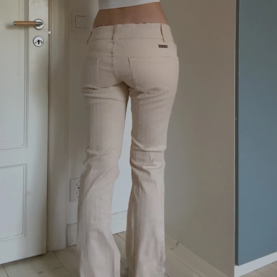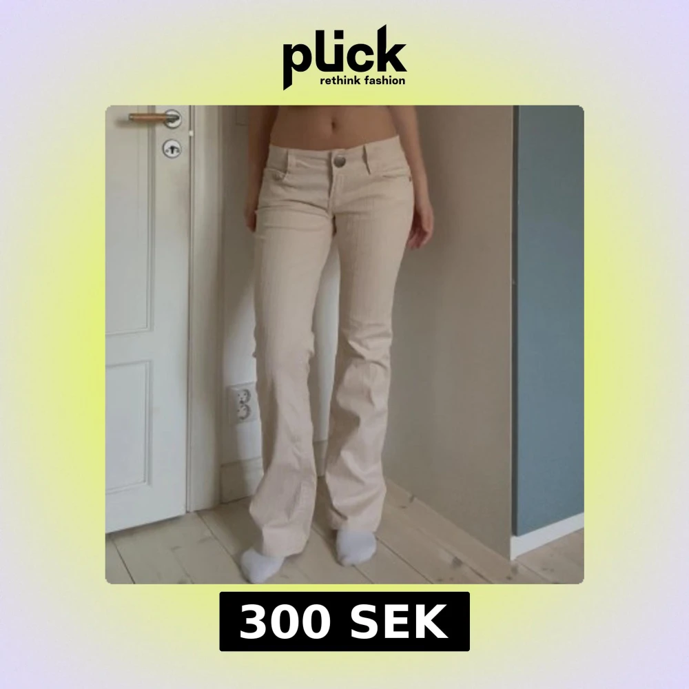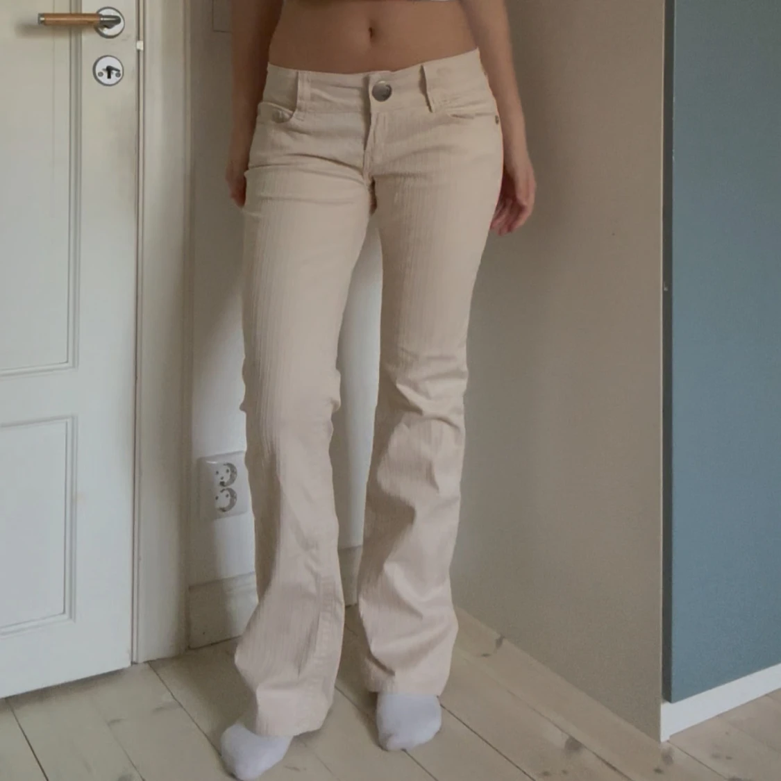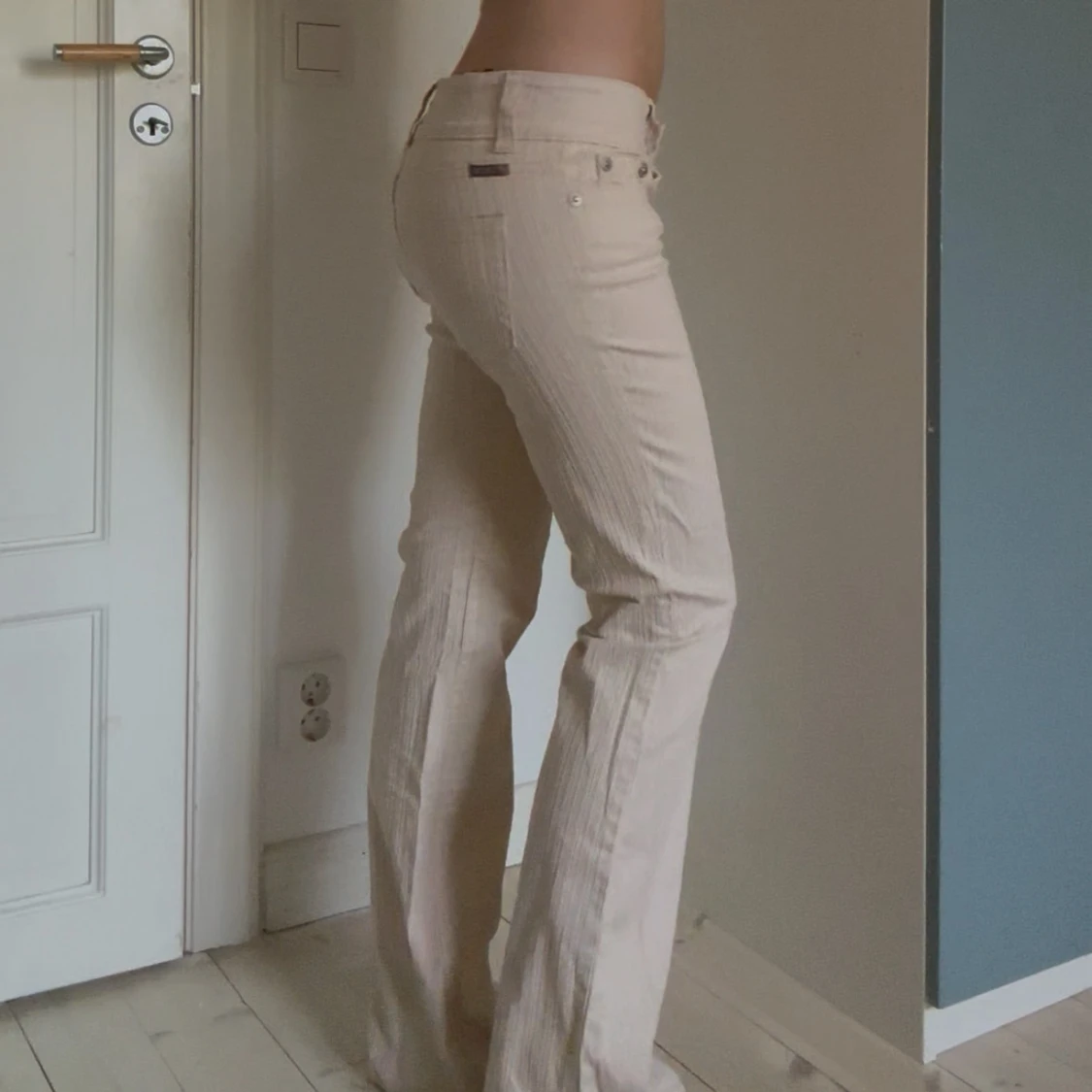 Säljer ett par beiga bootcut-byxor från American Flavour med diskret randigt mönster. Byxorna har låg midja, klassiska fickor och är tillverkade i bomullsmix med lite stretch. Perfekta för dig som gillar retrovibbar och vill ha en snygg siluett. Jag är 170 cm lång och innerbenslängden är 81 cm. Midjemåttet rakt över är 40 cm