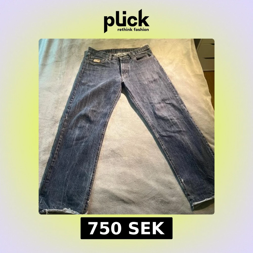 Vintage bape jeans i blå denim med coolt tryck av figur och stjärna på bakfickorna. Klassisk rak passform och normal midja. Jeansen har slitna benslut för en avslappnad vibe och är tillverkade i robust bomullsjeans.