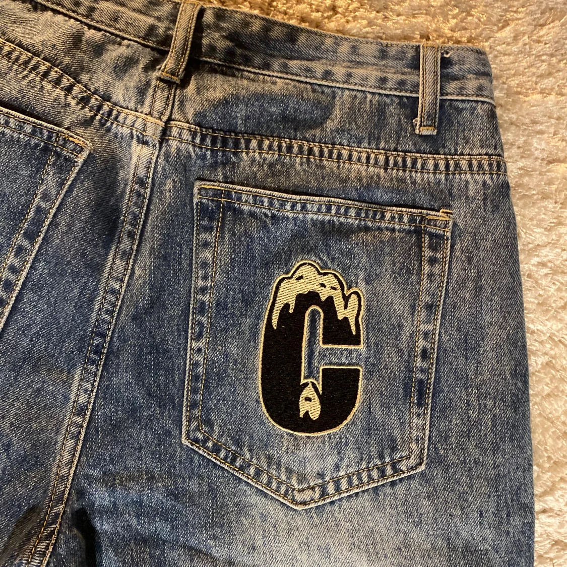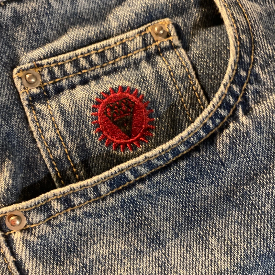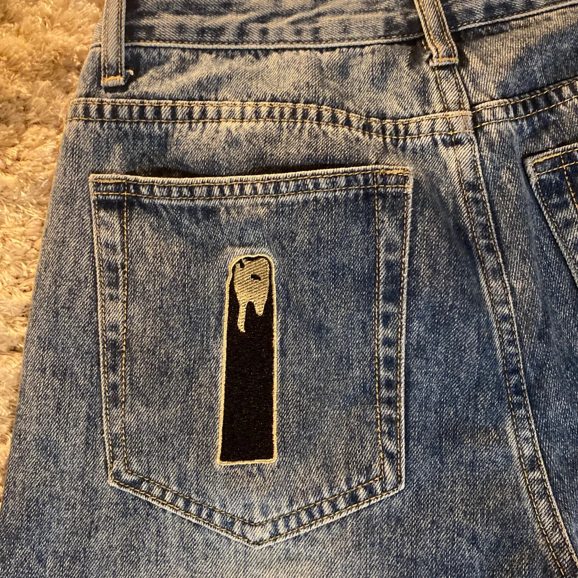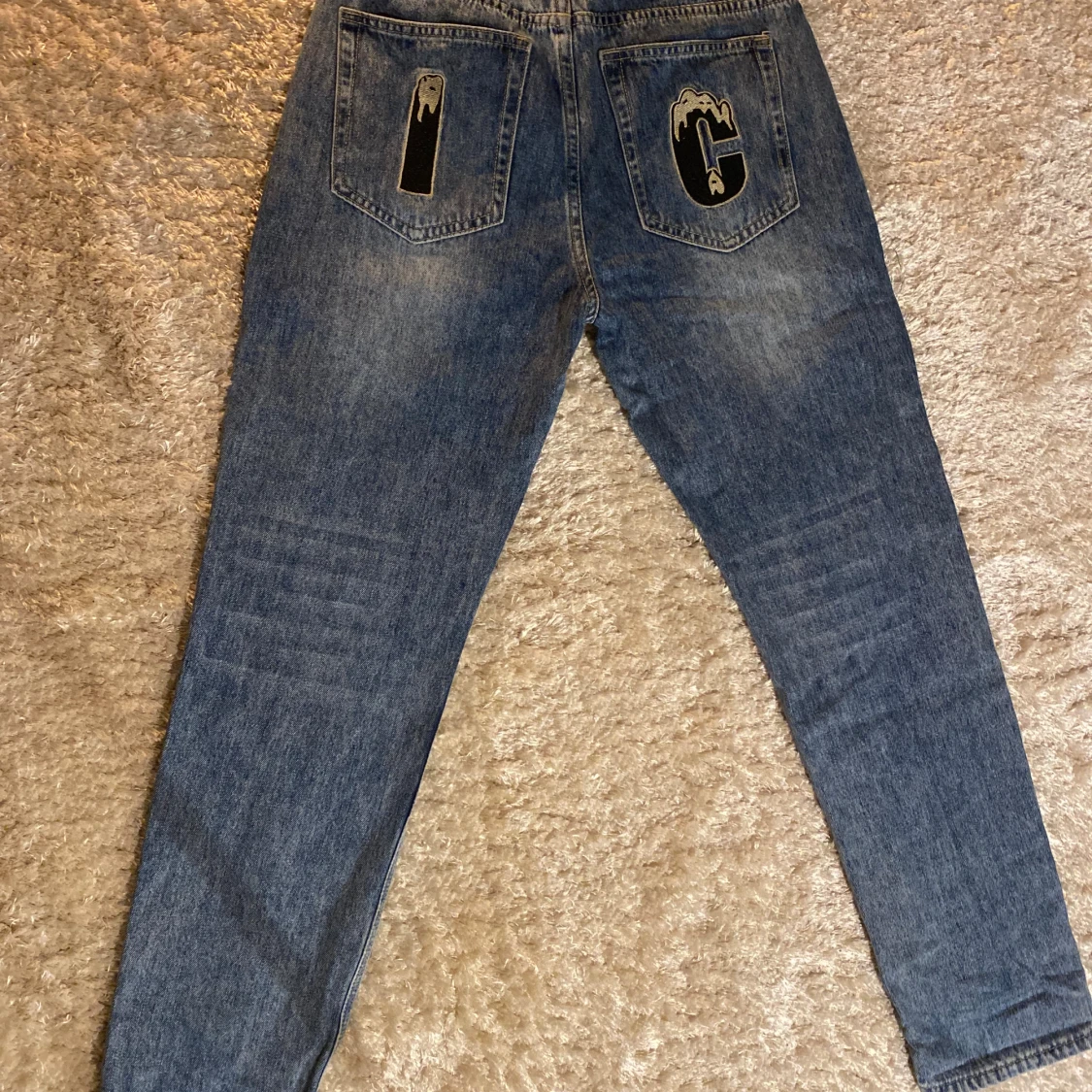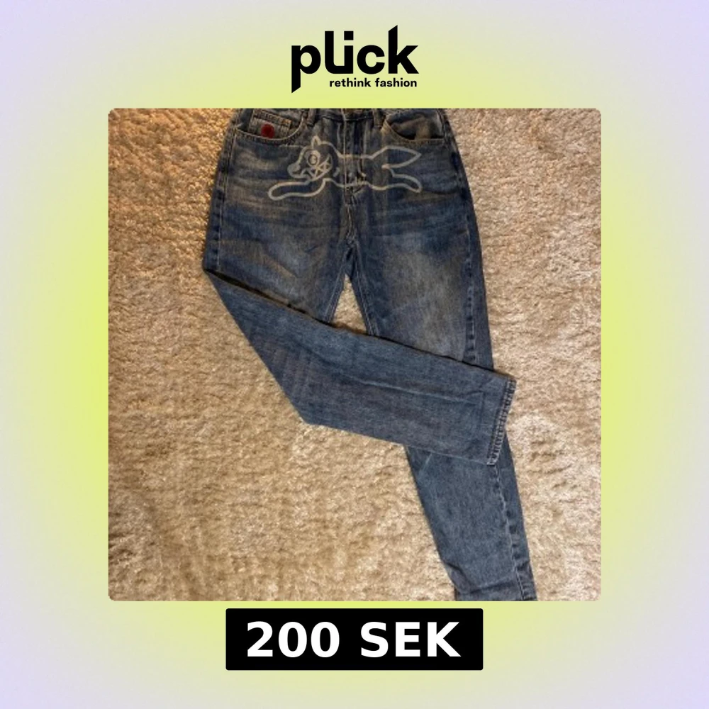 Unika blå jeans med coolt tryck av en tecknad figur framtill och broderade detaljer på bakfickorna. Snygg röd brodyr på myntfickan. Jeansen har en rak passform och är tillverkade i klassiskt denimtyg. Perfekta för dig som vill sticka ut med din stil.
