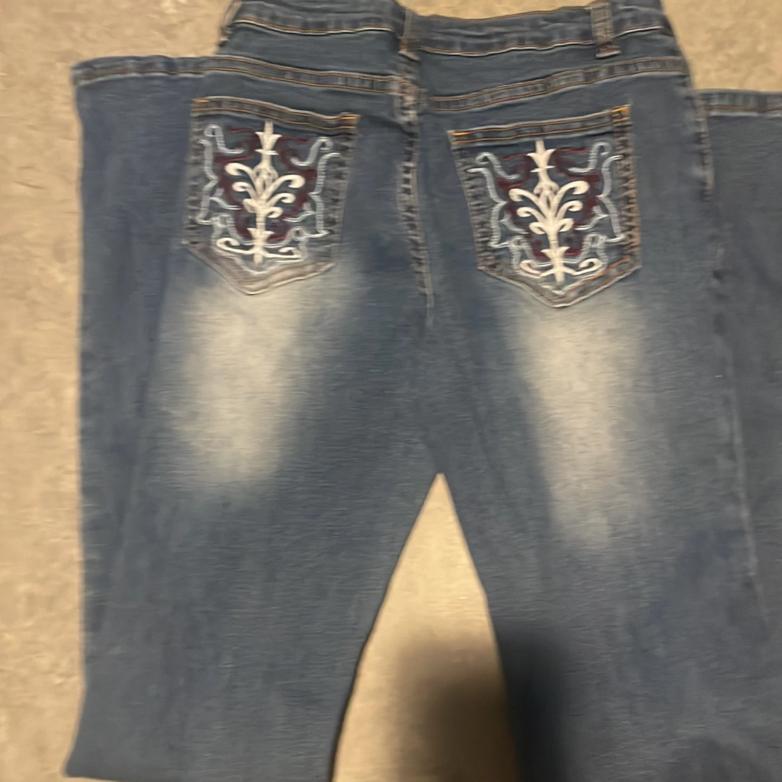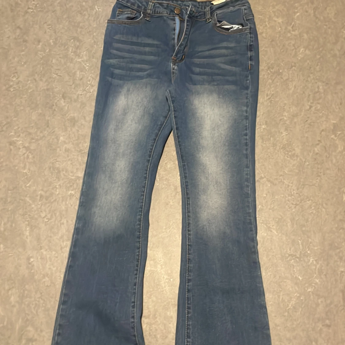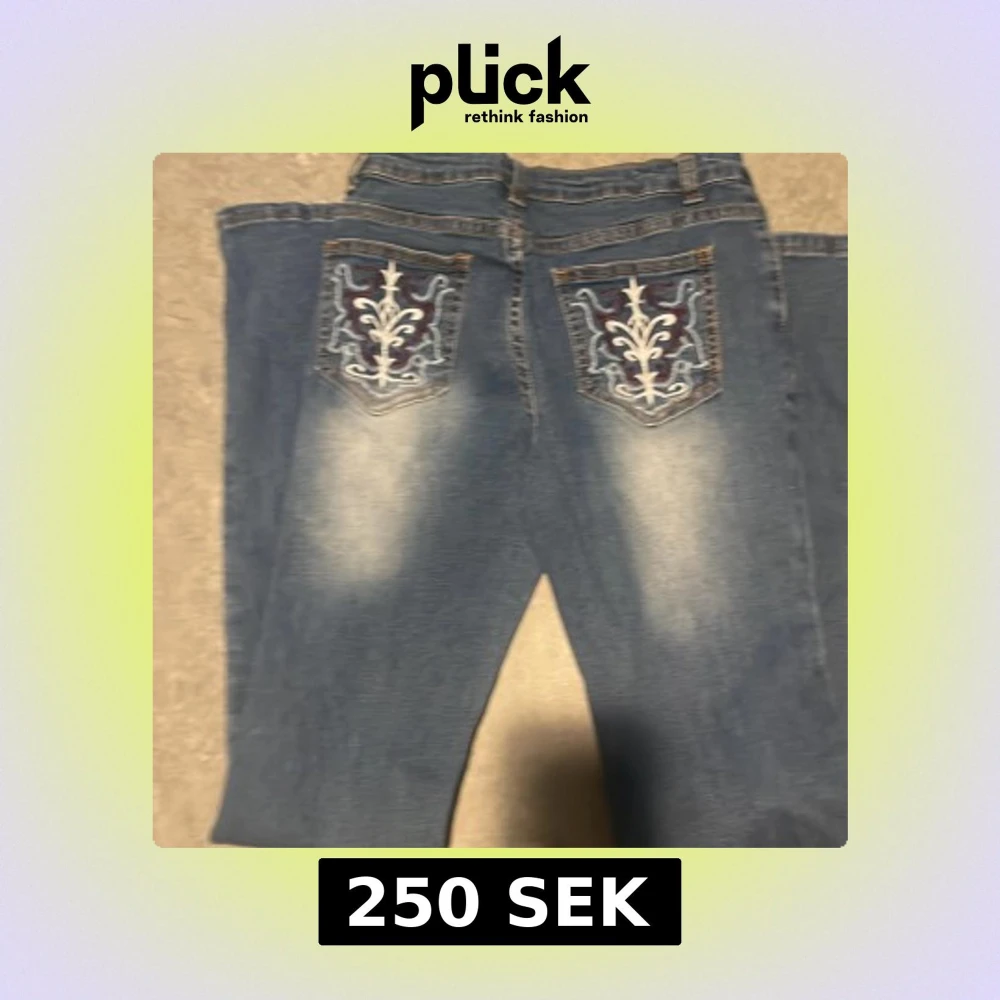 Säljer ett par blå bootcut jeans med snygga broderade detaljer på bakfickorna. Jeansen har en klassisk femficksdesign och lätt slitna partier framtill för en cool look.