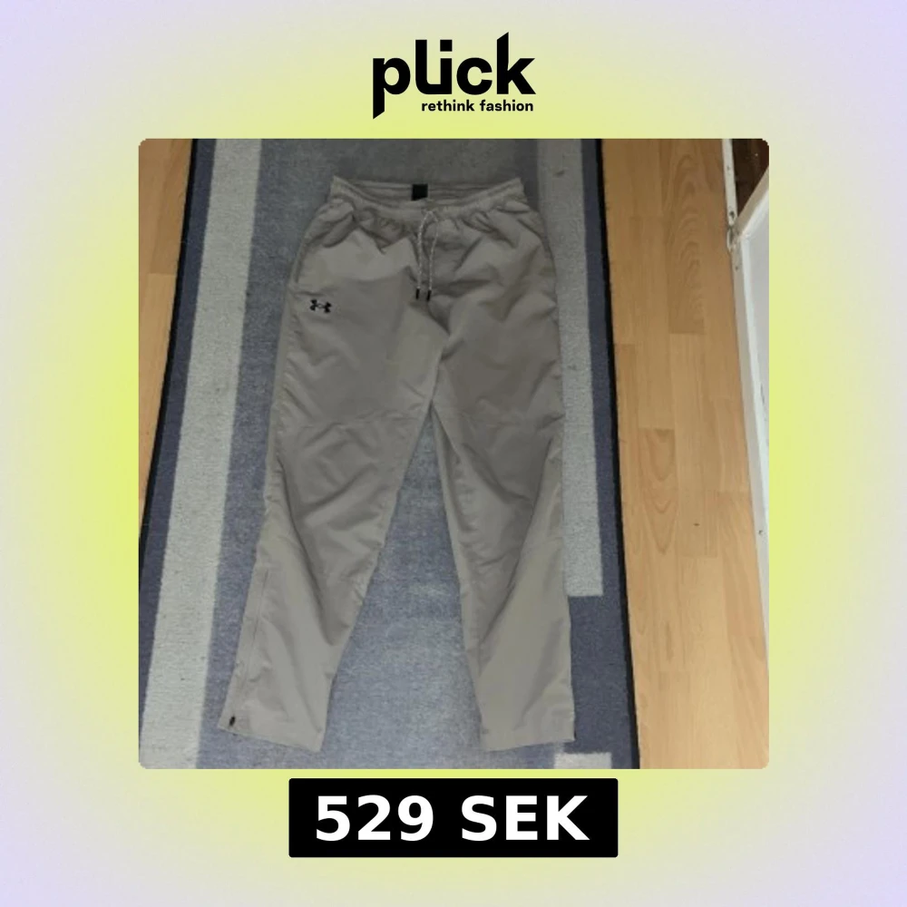 Säljer ett par beige träningsbyxor från Under Armour. Byxorna har en elastisk midja med snörning och är perfekta för träning. De har en avslappnad passform och är tillverkade i ett lätt syntetmaterial. Har använt de 1 gång!Vill få bort den så fort som möjligt! Snabbast får!!