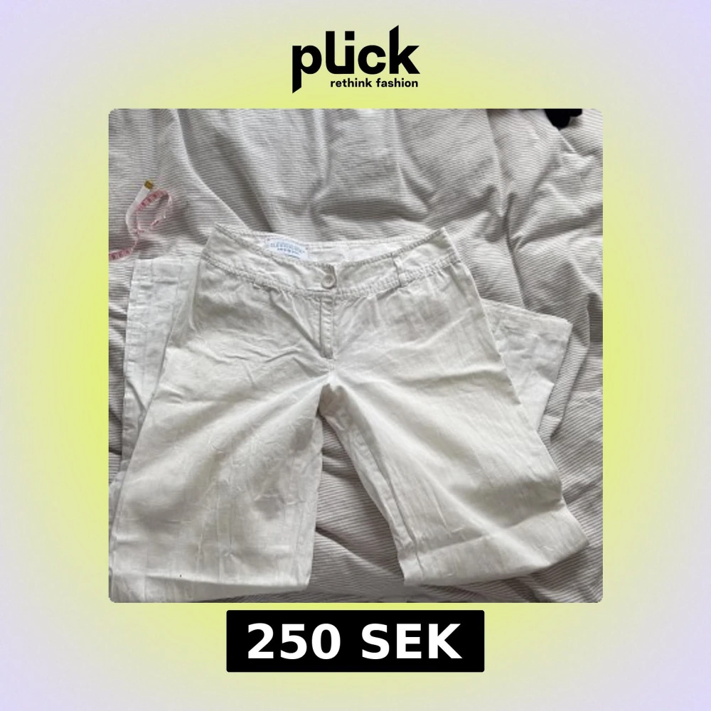 Snygga vita linnebyxor från Clockhouse med vida ben och normal passform. Byxorna har klassisk midja, knapp och dragkedja framtill samt två bakfickor. Perfekta för en fräsch och avslappnad look. Storlek xs/s Midjemått: 35cm / Grenlängd: 21cm / Innerbenslängd: 81cm.