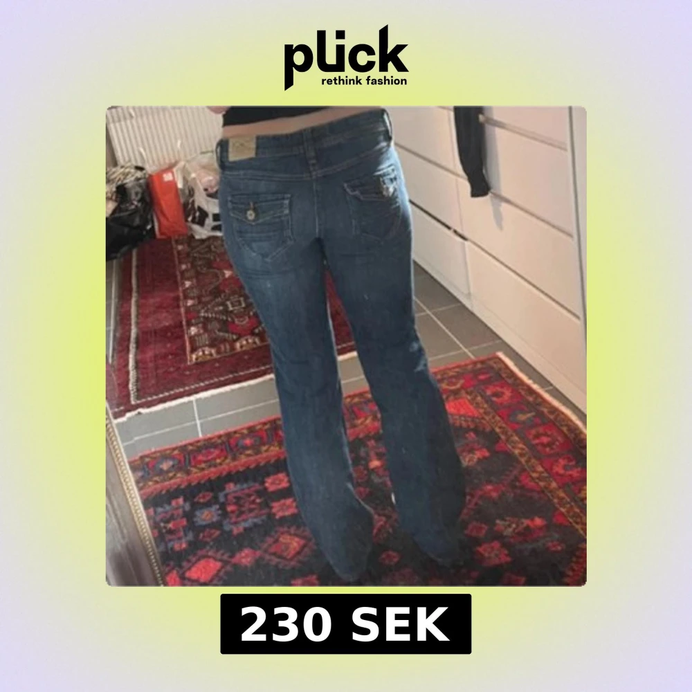 Snygga blå jeans i klassisk bootcut-modell. Jeansen har låg midja, raka ben med lätt utsvängning och coola detaljer på bakfickorna. Tillverkade i slitstark denim med en mörkblå tvätt. Perfekta för dig som gillar en tidlös och avslappnad stil. Storlek W31 L32, ungefär en M