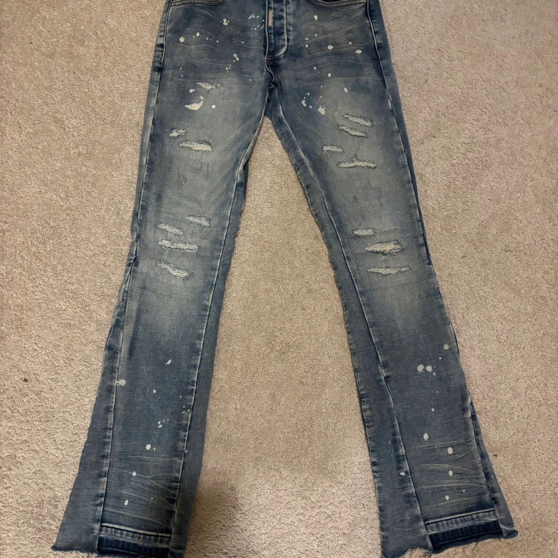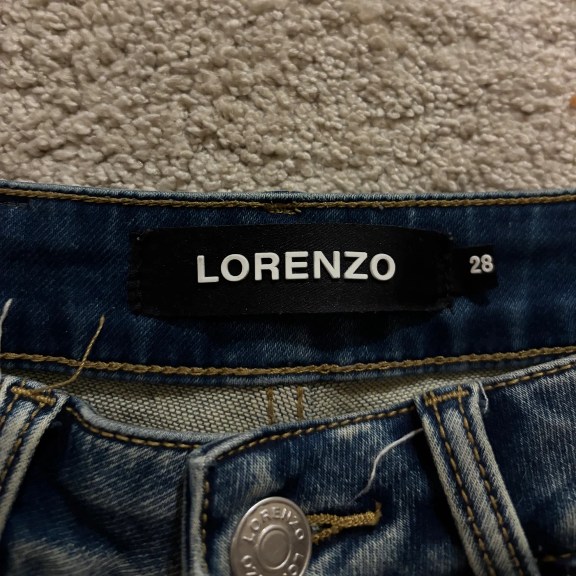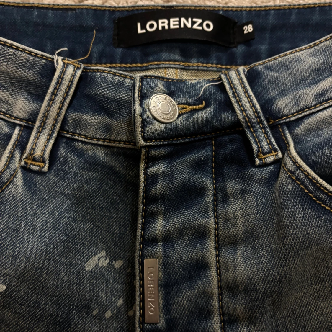 Säljer ett par flared ljusblå jeans från Lorenzo med coola slitningar och färgstänk. Jeansen har raka ben med lätt bootcut och klassisk. Säljer för dom va för små, knappast använda👍