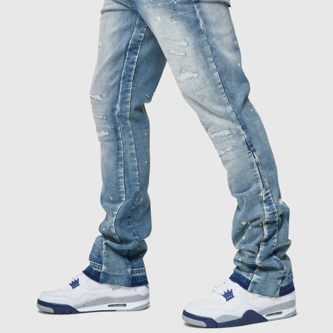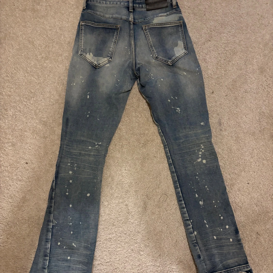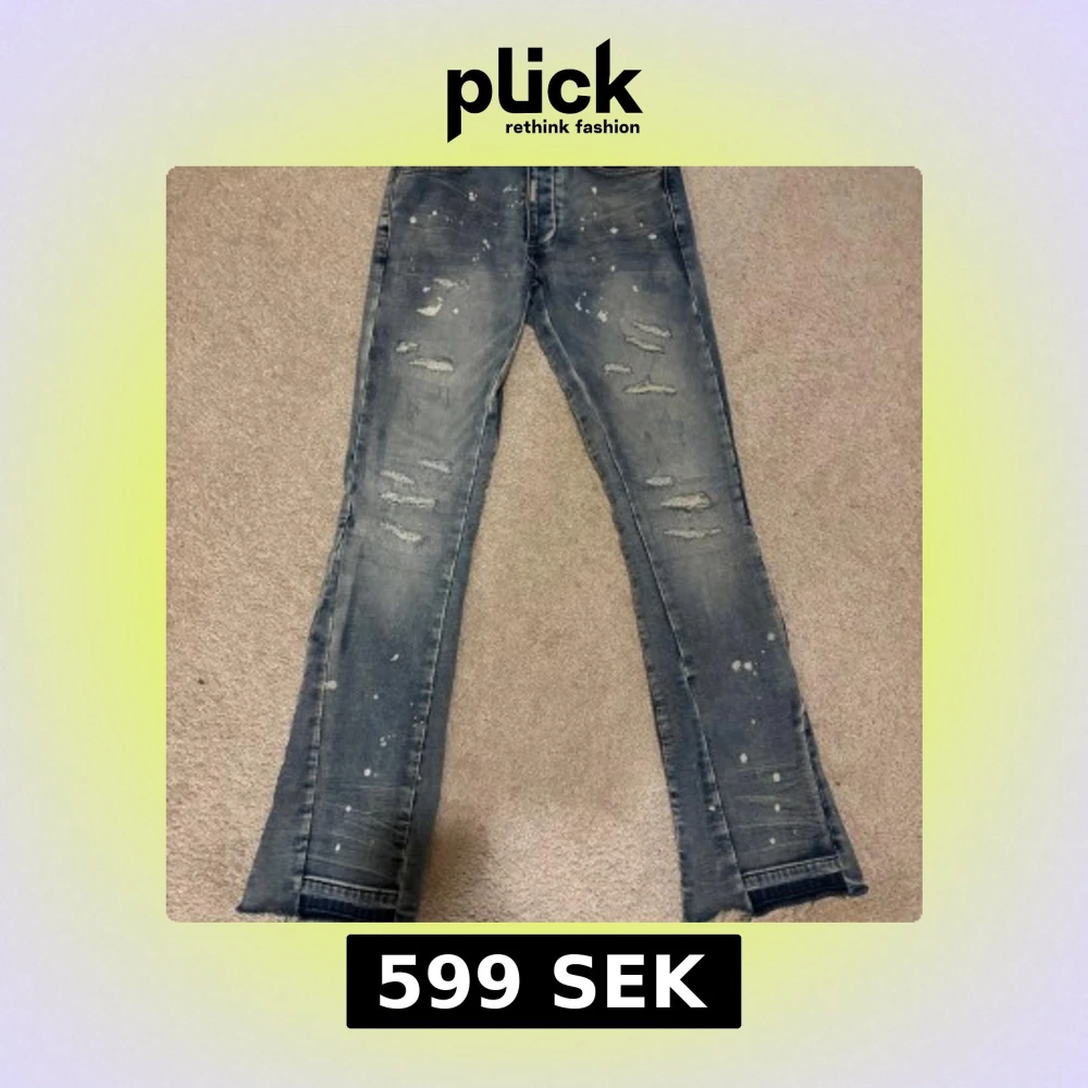 Säljer ett par flared ljusblå jeans från Lorenzo med coola slitningar och färgstänk. Jeansen har raka ben med lätt bootcut och klassisk. Säljer för dom va för små, knappast använda👍