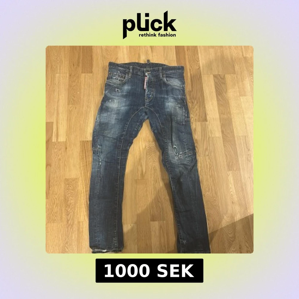 Säljer ett par blåa jeans med storlek 44 (män) från Dsquared2 med coolt distressed look, slitningar och färgstänk. Klassisk femficksmodell med Dsquared2-logga vid gylfen och stor patch bak. Jeansen har raka ben och tydliga sömmar över knäna för extra edge. Använts ett par gånger. Pris kan diskuteras.