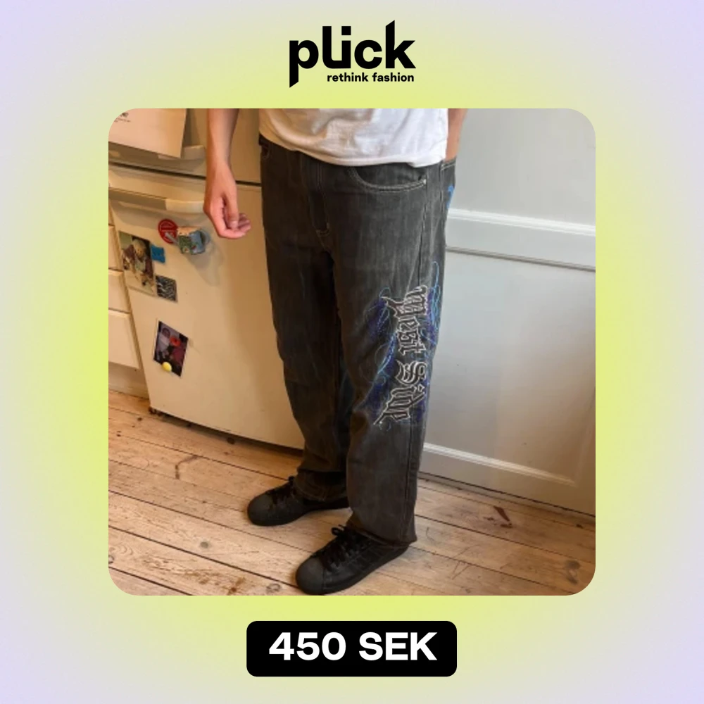 Tja, säljer dessa feta Y2K jeans, jag är osäker på måtten men jag är iallafall 177cm med en 30 i midja och dem passar mig bra! Skick är 8/10!