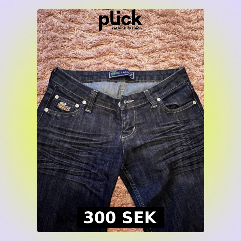 Skit Snygga mörkblå bootcut jeans från Lacoste med klassisk krokodillogga på fickan och bak Samt låg midja. Har tyvärr växt ut dom. Jag är 170 och de passar bra på mig i längden. Dom är inte för korta. Skulle säga att de sitter bra på någon med xs. Köpte de från plick innan och de var tidigare syda till bootcut tror jag men det är inget man märker av!