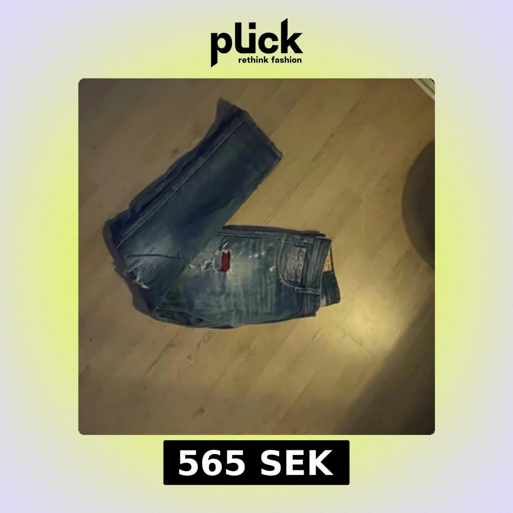 Säljer ett par Replay Anbass jeans i blå tvätt med slitningar och trasiga detaljer, inklusive en röd patch på låret. Jeansen har klassisk femficksdesign, knappgylf och raka ben. Perfekt för dig som gillar en edgy och avslappnad stil.