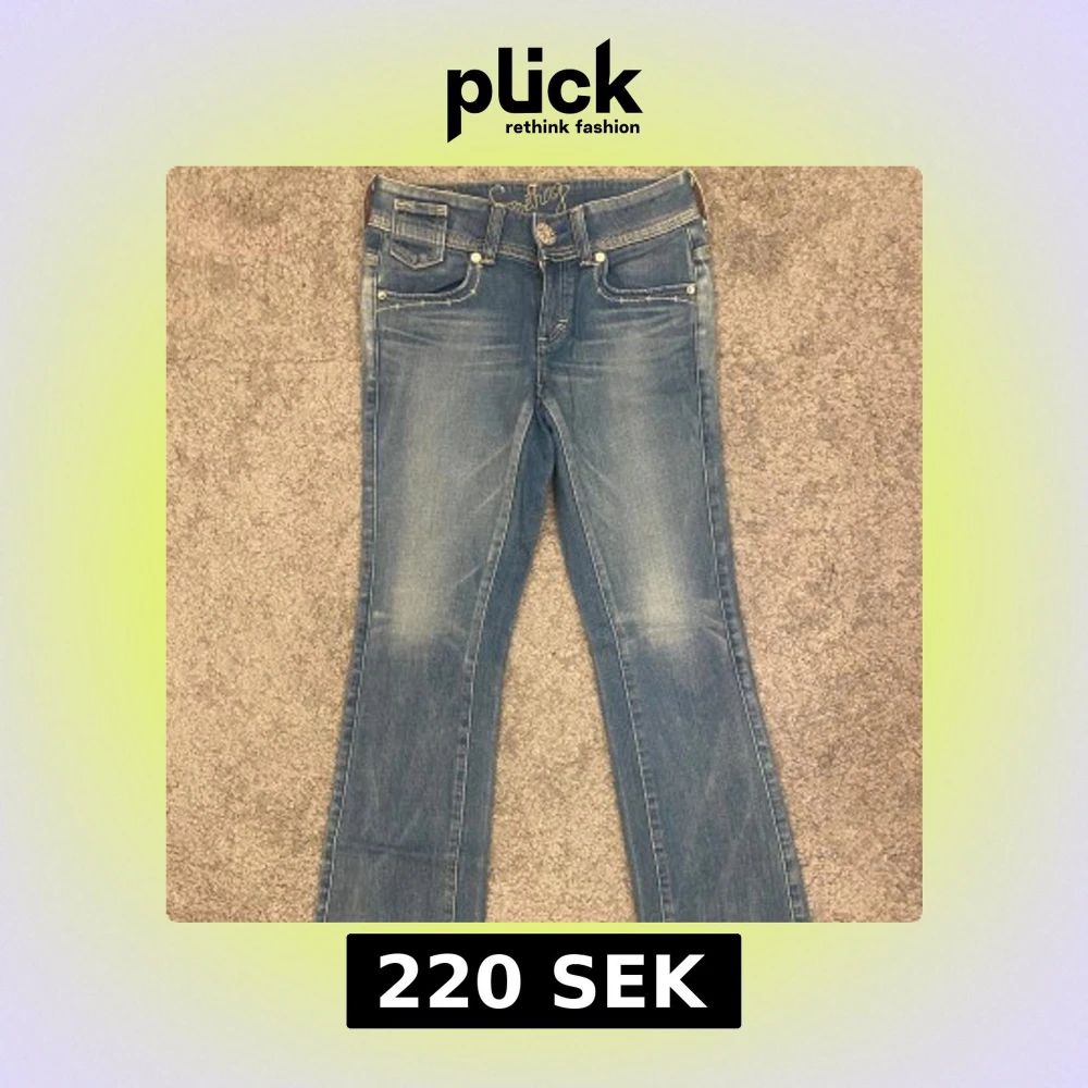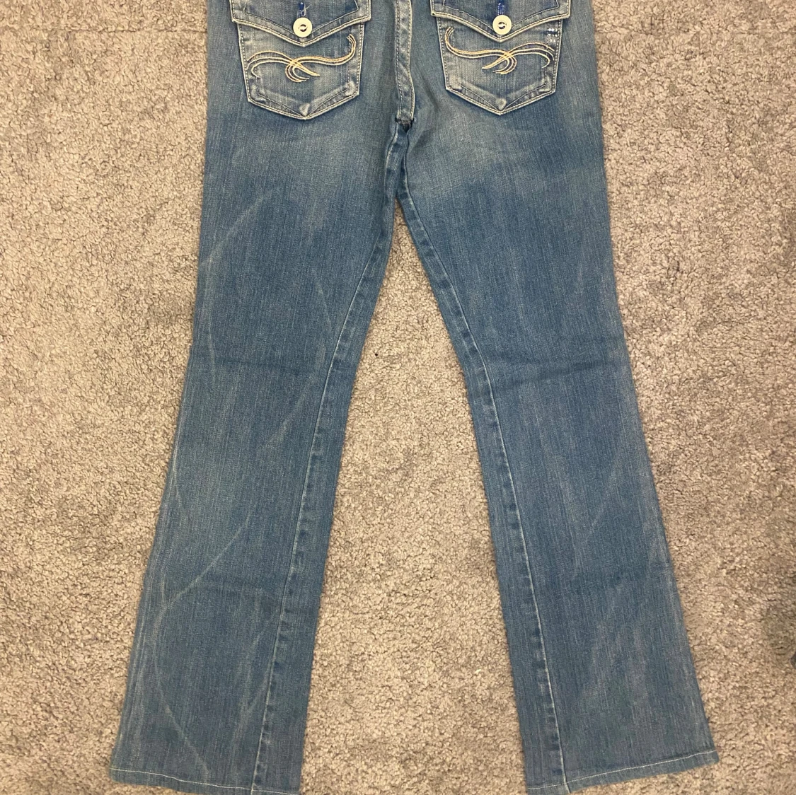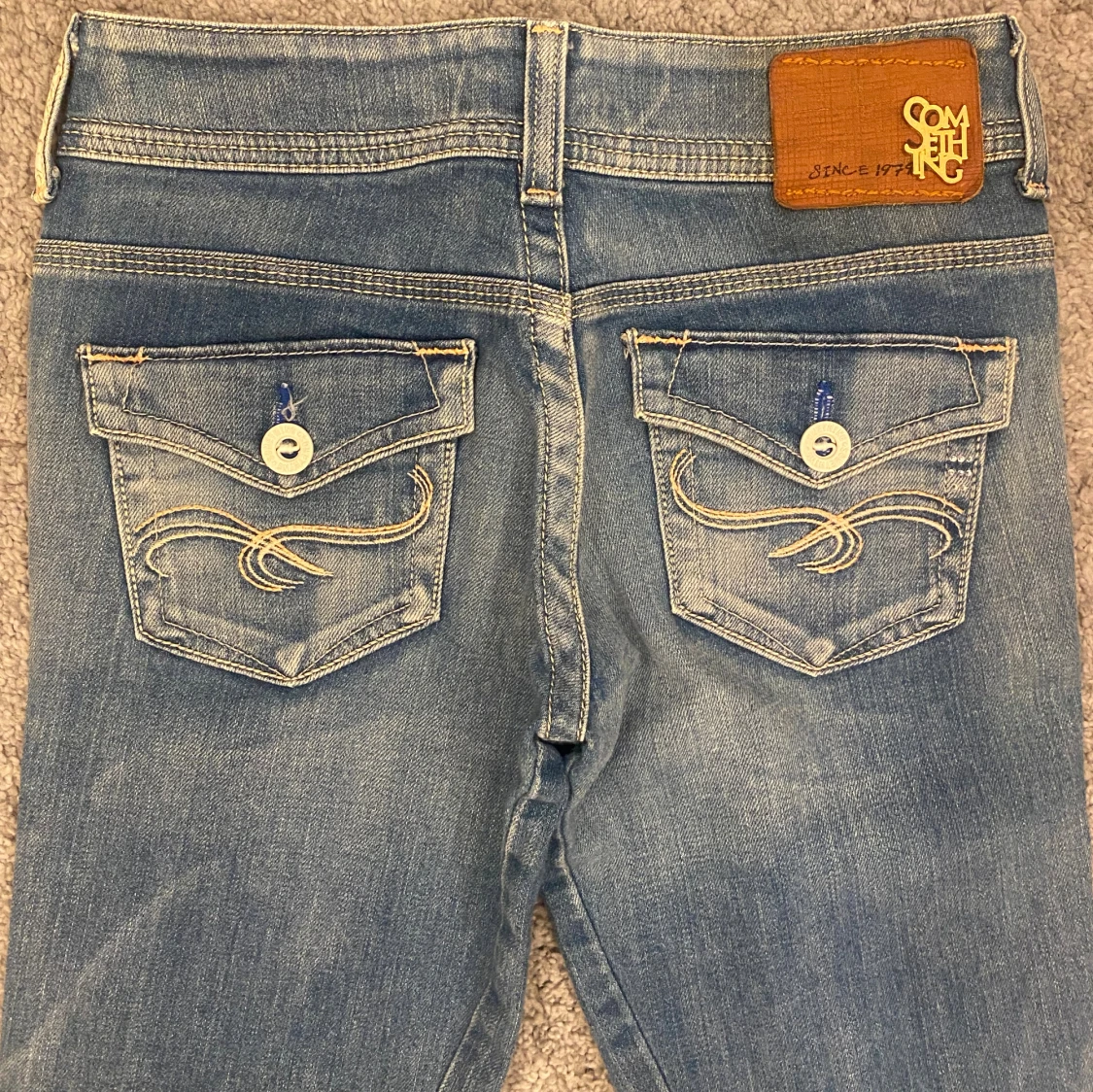 Snygga ljusblå bootcut jeans från Something med klassisk femficksdesign och broderade bakfickor med knappar. Jeansen har normal passform och är tillverkade i mjukt denimtyg. Perfekta för en avslappnad och trendig look. Midja rakt över: 36cm Lår: 23cm Innerben: 73cm