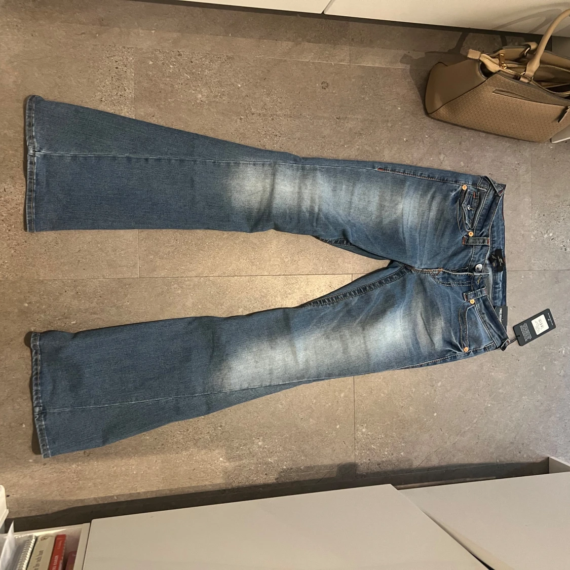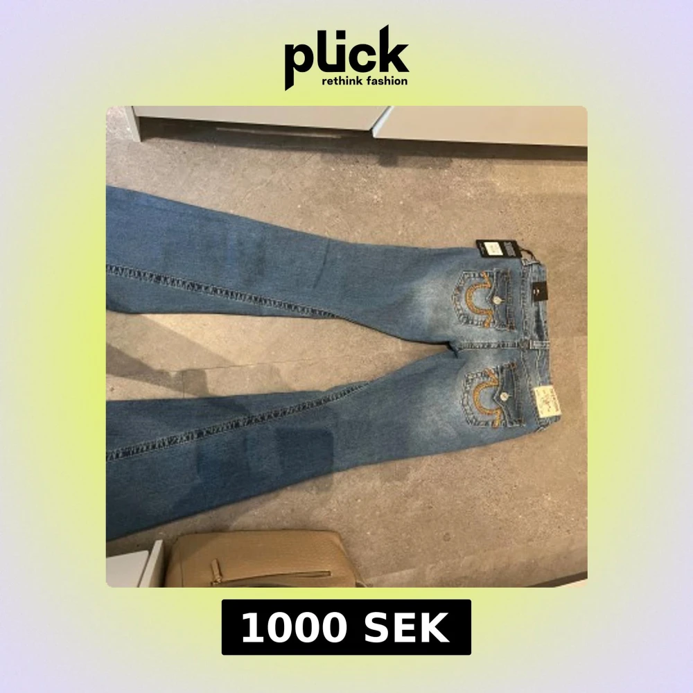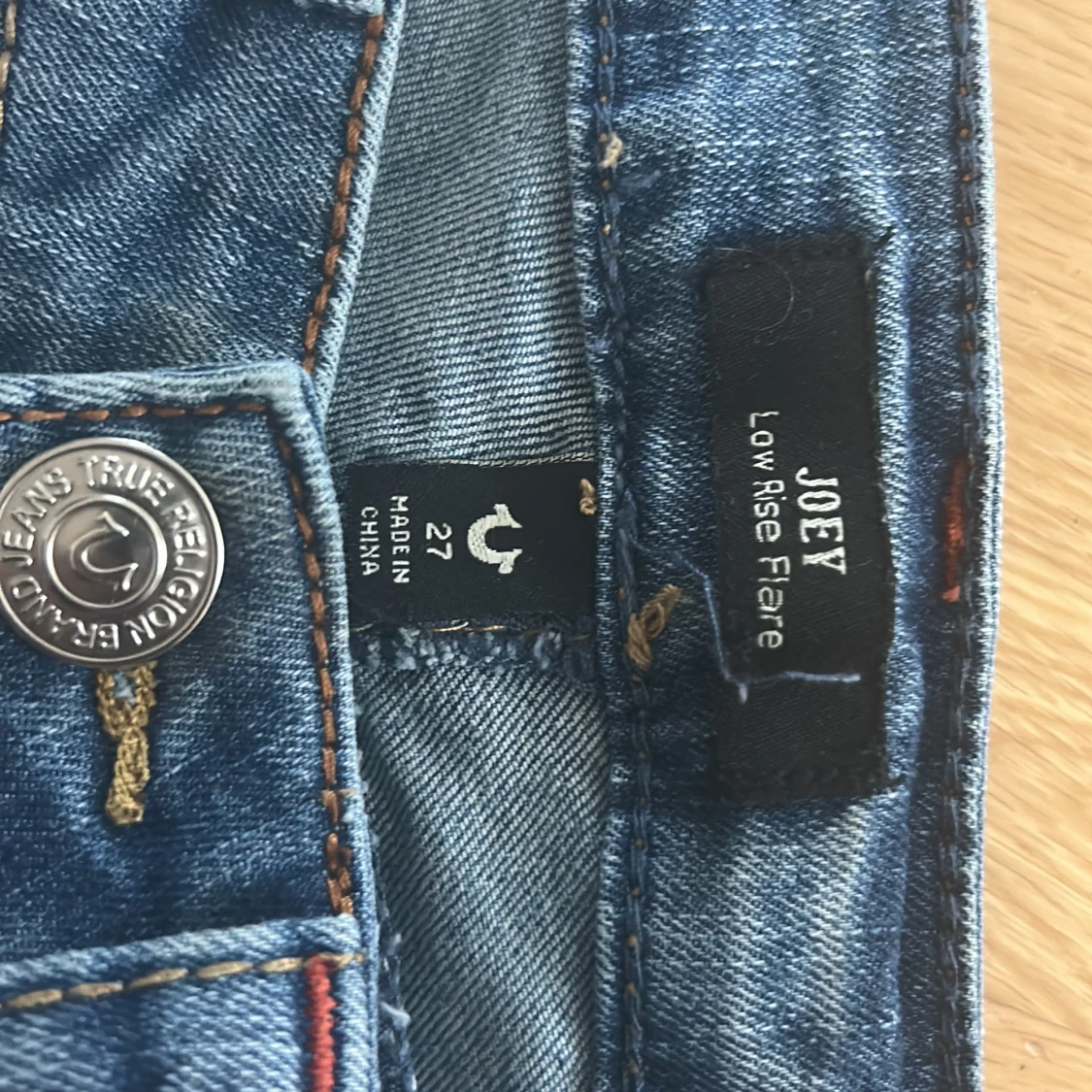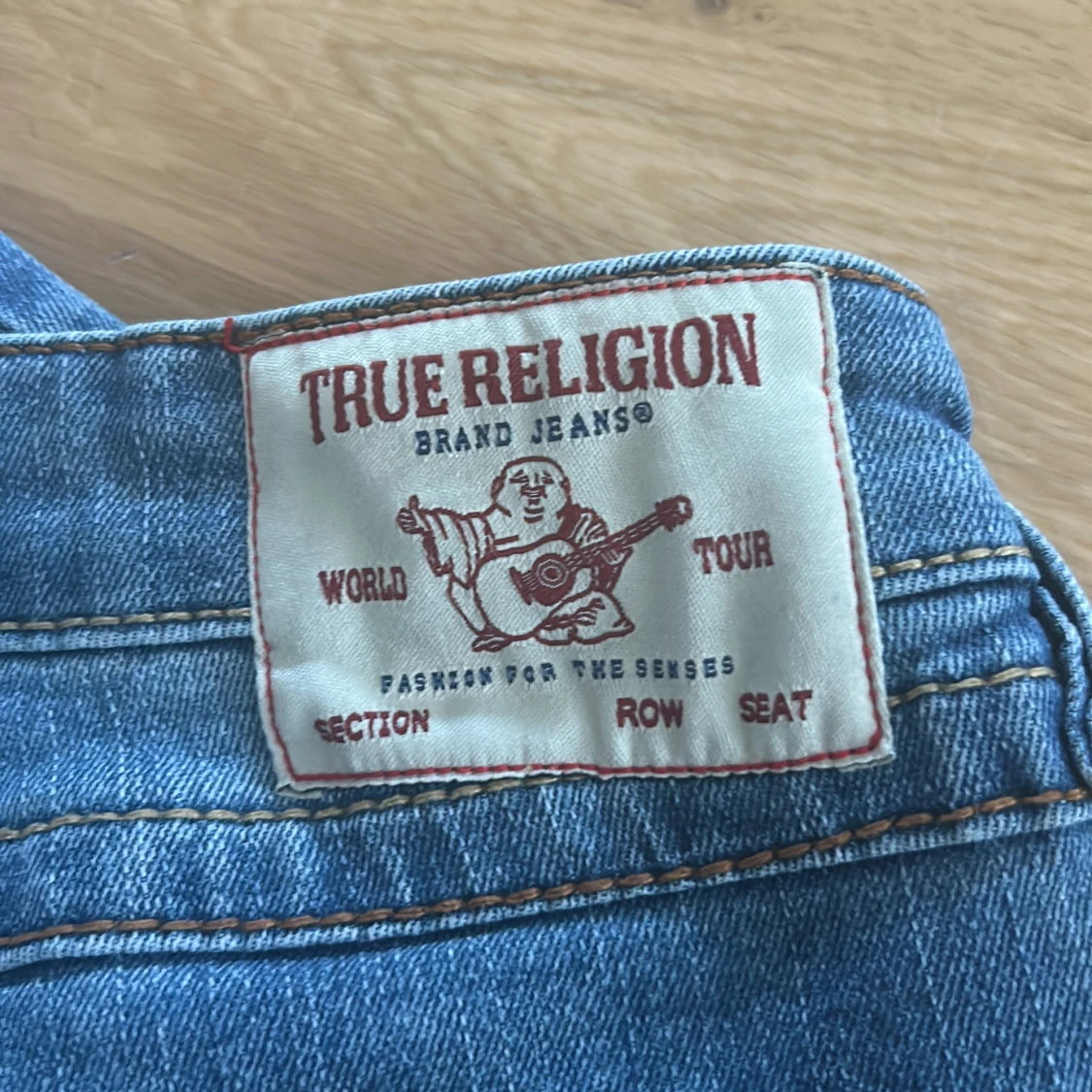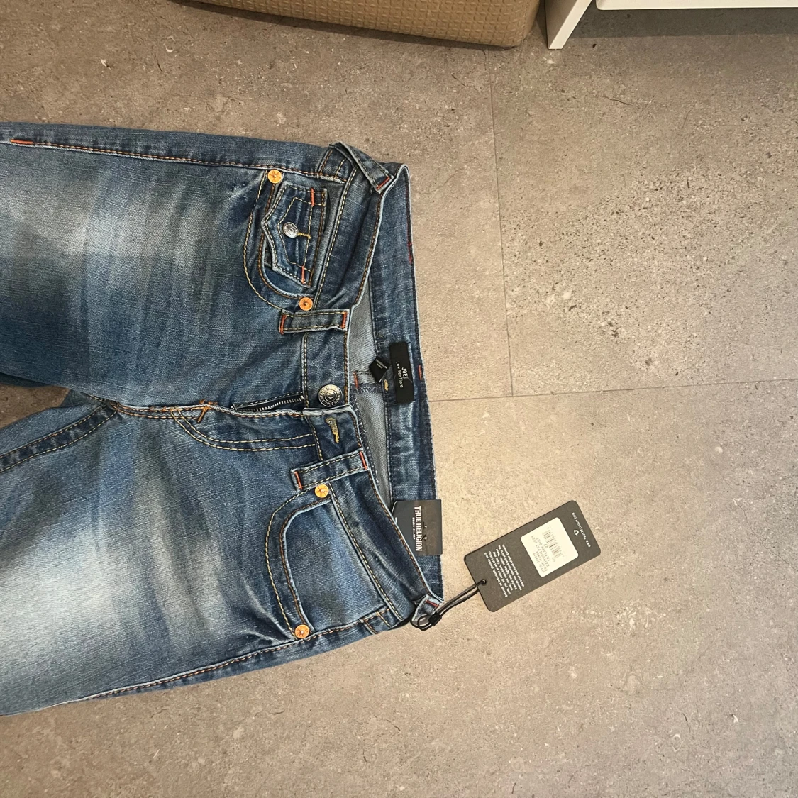 Snygga blå bootcut jeans från true religon med coola broderade detaljer på bakfickorna och slitningar framtill. Jeansen har klassisk femficksdesign, orangea sömmar och gylf med dragkedja. och vill sticka ut lappen e kvar och är nya