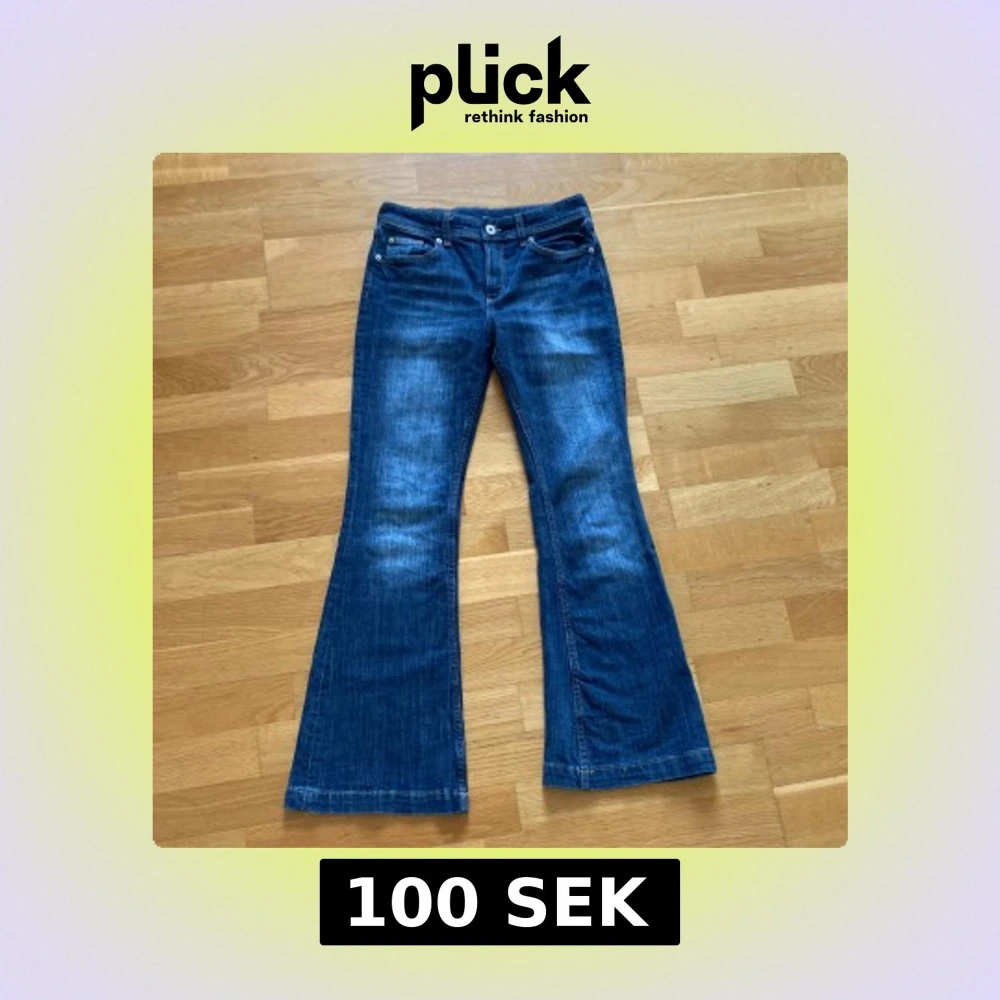 Säljer ett par snygga mörkblå, lågmidjade bootcut jeans från H&M med justerbar midja. Har bara användt ca 5 ggr. Vanligt jeans material.