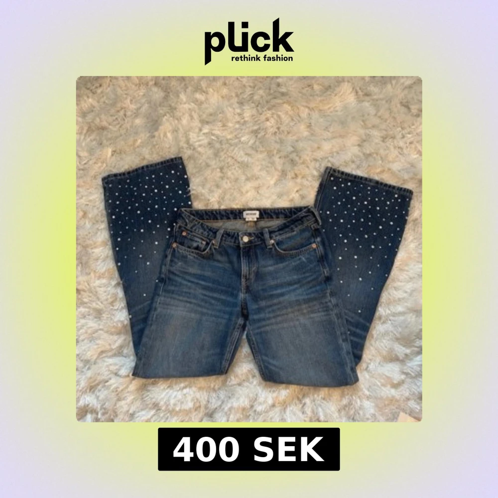 Säljer ett par mörkblå lågmidjade bootcut jeans med snygga pärldetaljer nertill. Jätte bra ackord i storlek 26💗 skriv för fler bilder eller mått