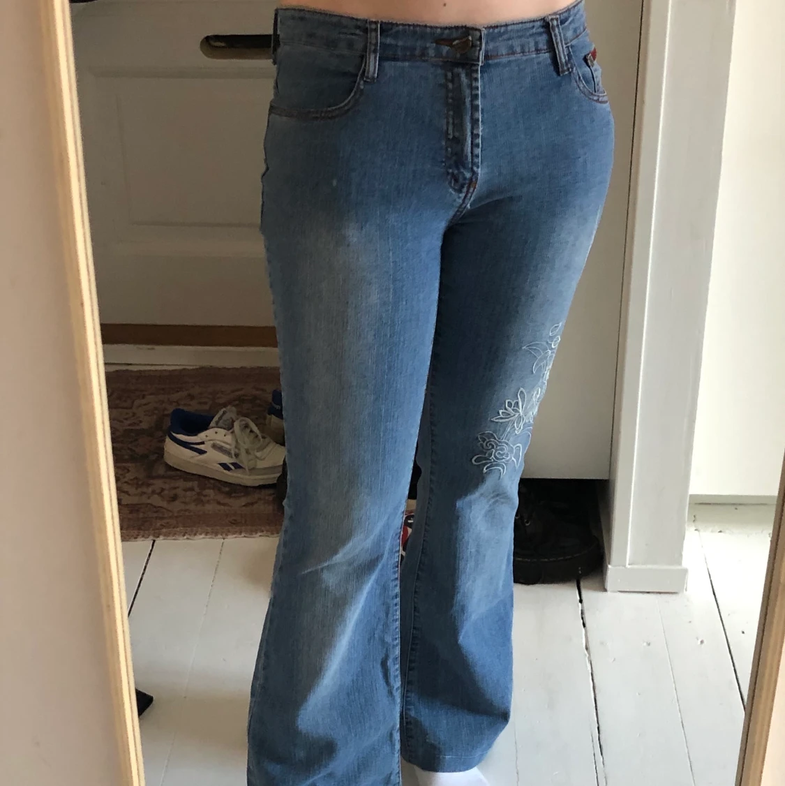 Snygga lågmidjade jeans med en broderad blomma. Jeansen är utsvängda. Köpt second hand.