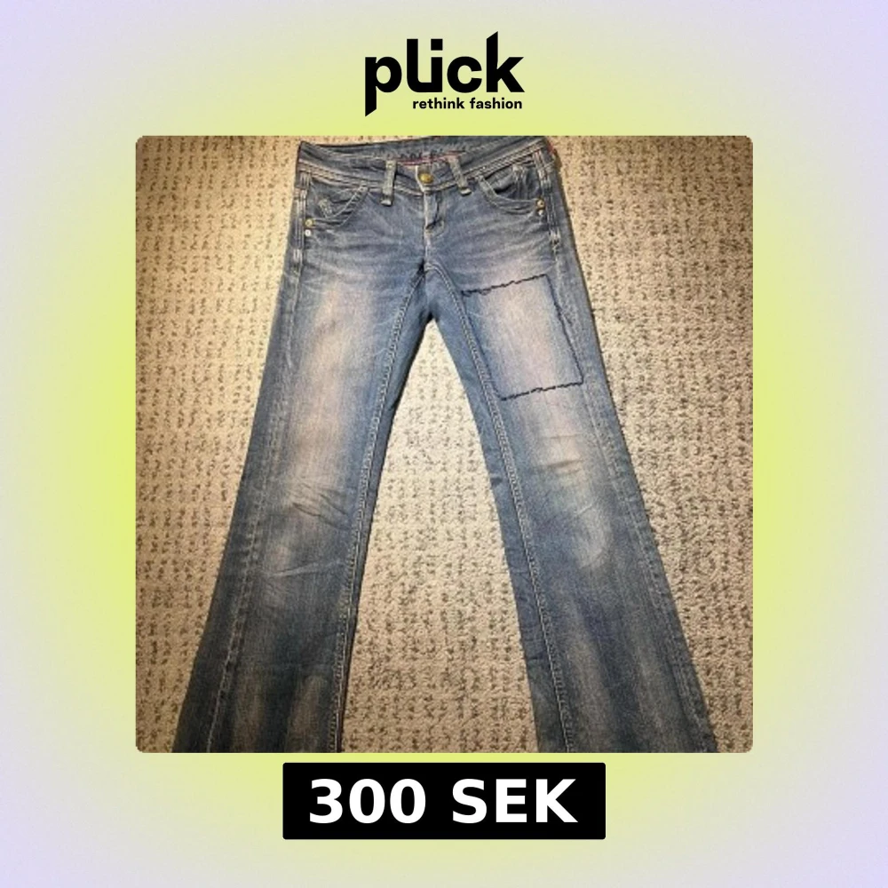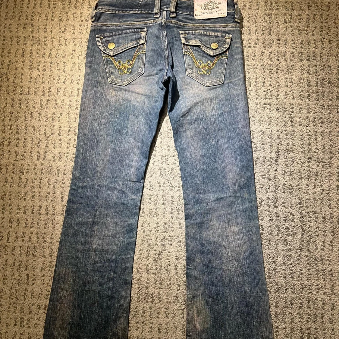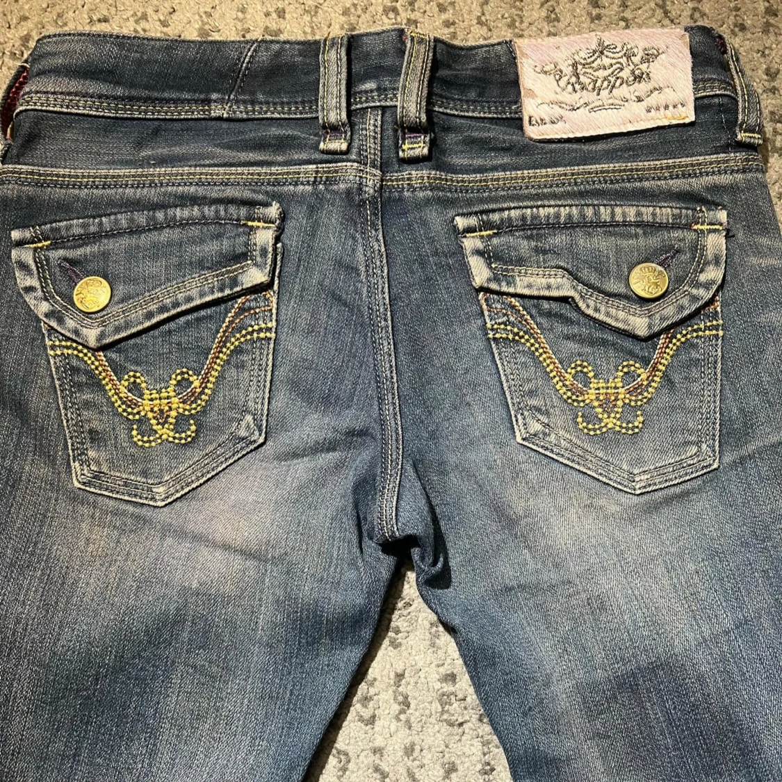 Snygga blå jeans med unika broderade detaljer på bakfickorna. Trådarna på framsidan är designen (jeansen har inte gått sönder). De är bootcut. Midja rakt över: 36cm. Lår: 26cm. Innerben: 85cm