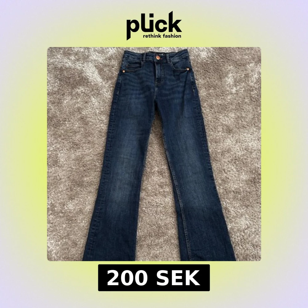 Snygga mörkblå jeans med bootcut-stil. De har klassiska fem fickor och en knappgylf. Perfekta för en avslappnad look med en touch av retro. Använda ca 5 gånger så i nyskick. Nypris ca 250. Priset är förhandlingsbart. Hör av er för frågor eller fler bilder ❤️