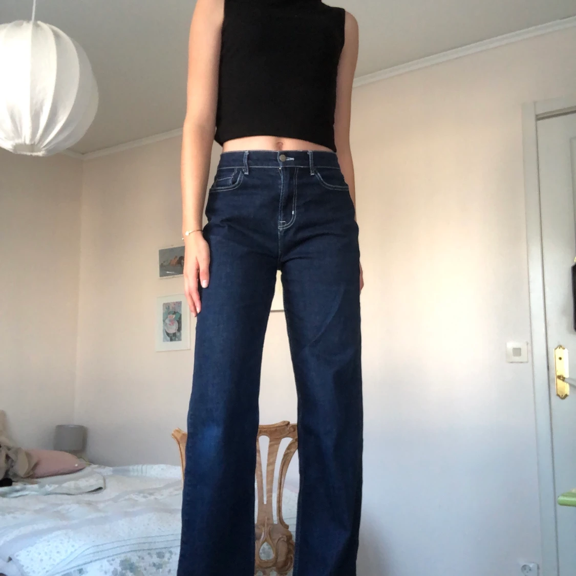 Mörkblå jeans med vita stygn från Nelly i gott skick. Sitter tajt vid midjan och löst över benen. Superstrechiga och bekväma 🧚🏼♀️