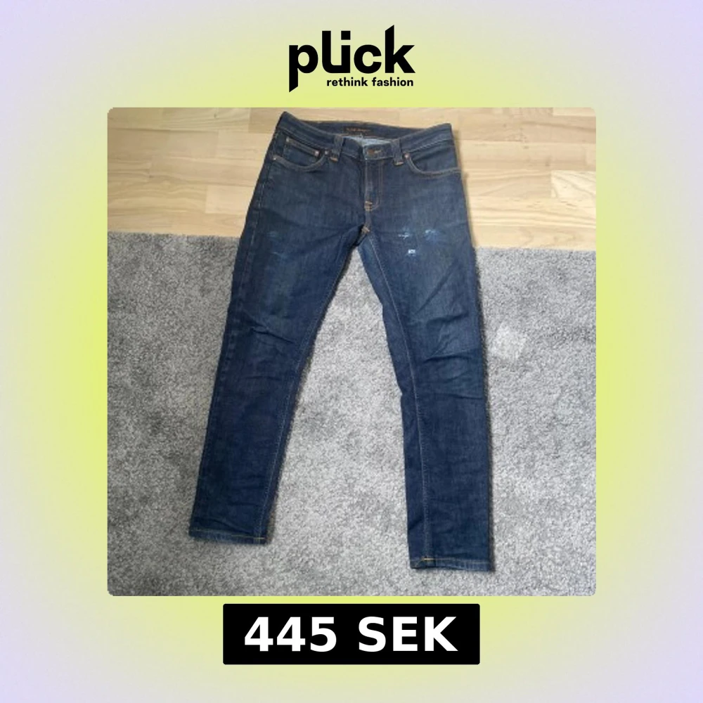Säljer ett par mörkblå jeans från Nudie Jeans i ekologisk bomull. Klassisk femficksmodell med orange sömmar och raka ben. Snygga slitningar på baksidan av fickorna och diskreta slitdetaljer framtill.