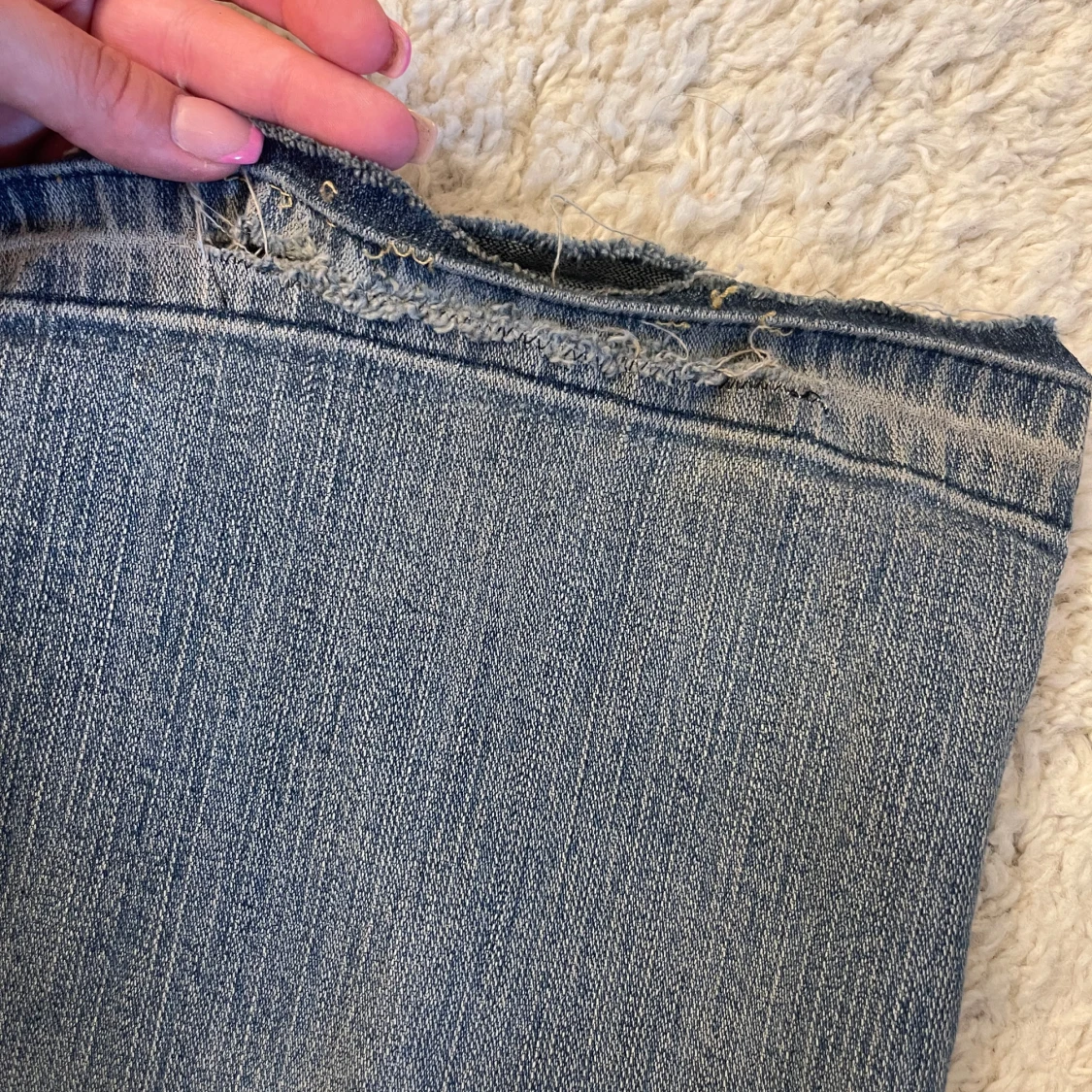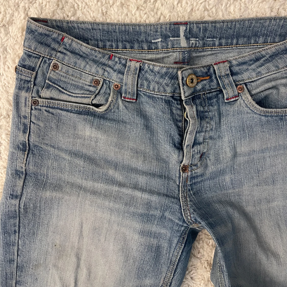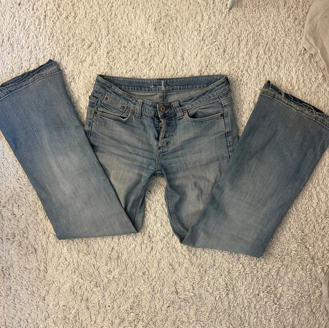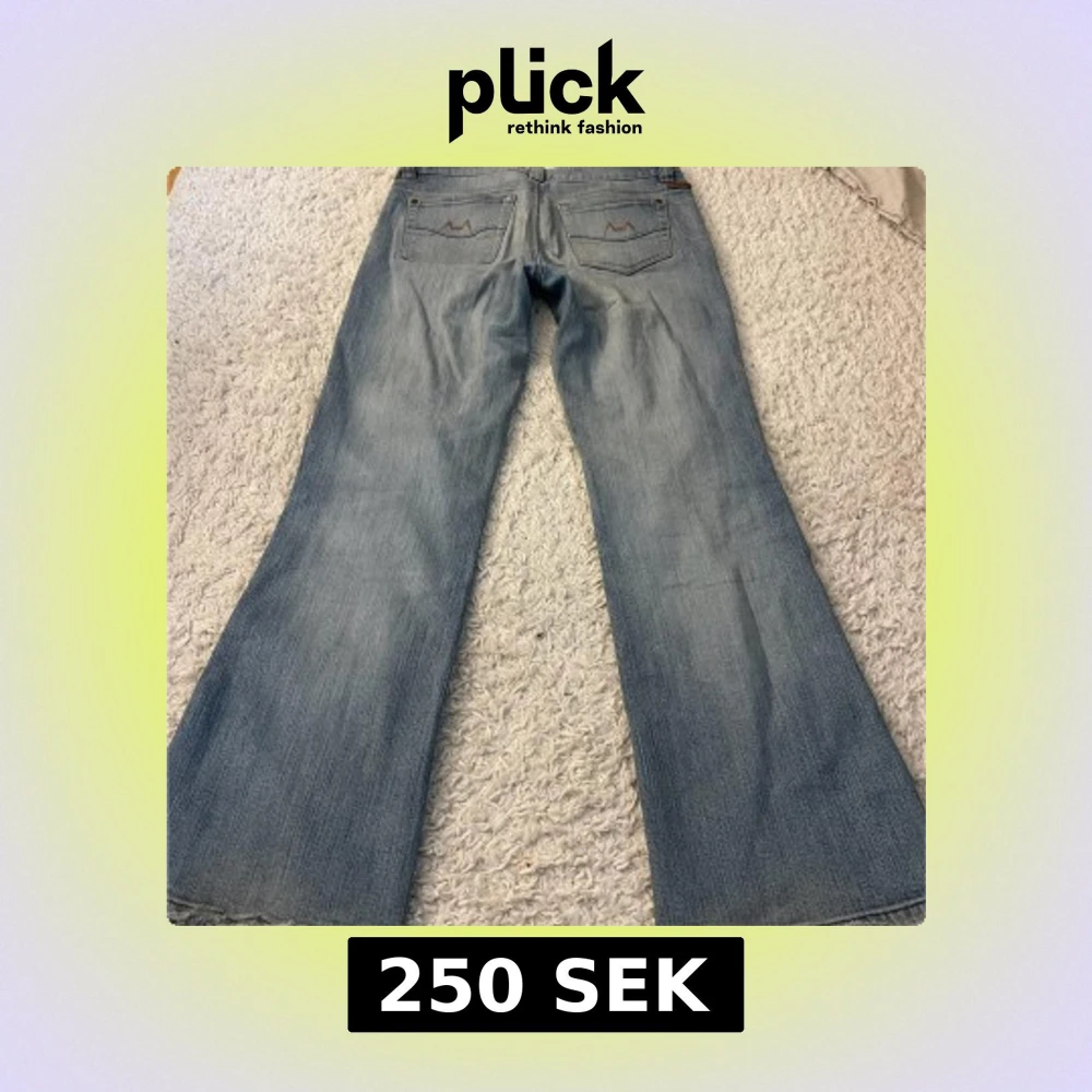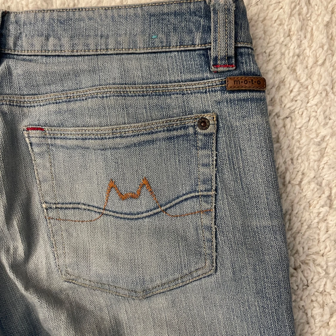Snygga ljusblå lågmidjade jeans från Moto med bootcut passform och klassisk femficksdesign.Lite slitningar längst ner . Midjemått : 40cm Innerbenslängd : 77 cm