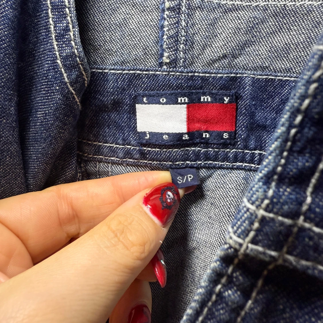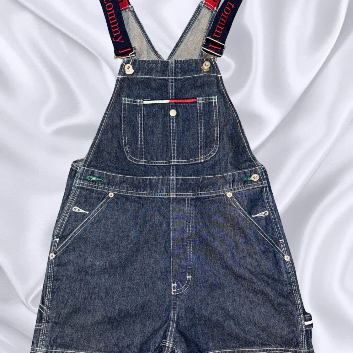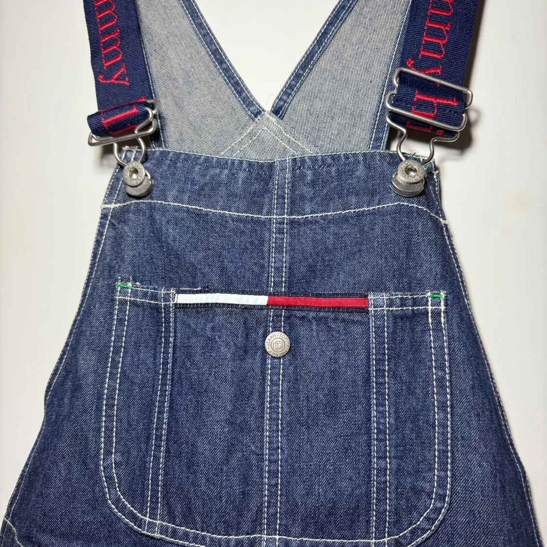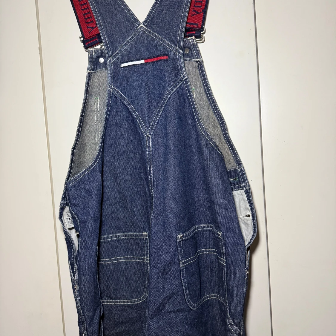 Mörkblå denim hängselbyxor från Tommy Hilfiger med justerbara axelband i marinblått med röd logotyp. Byxorna har flera fickor fram och bak, vita kontrastsömmar och detaljer i rött, vitt och grönt. Tillverkade i 100% bomull för en klassisk jeanskänsla. Otroligt snygga att ha till ett par boots eller en stickad tröja nu i höst. Eller en snygg T-shirt i sommar.