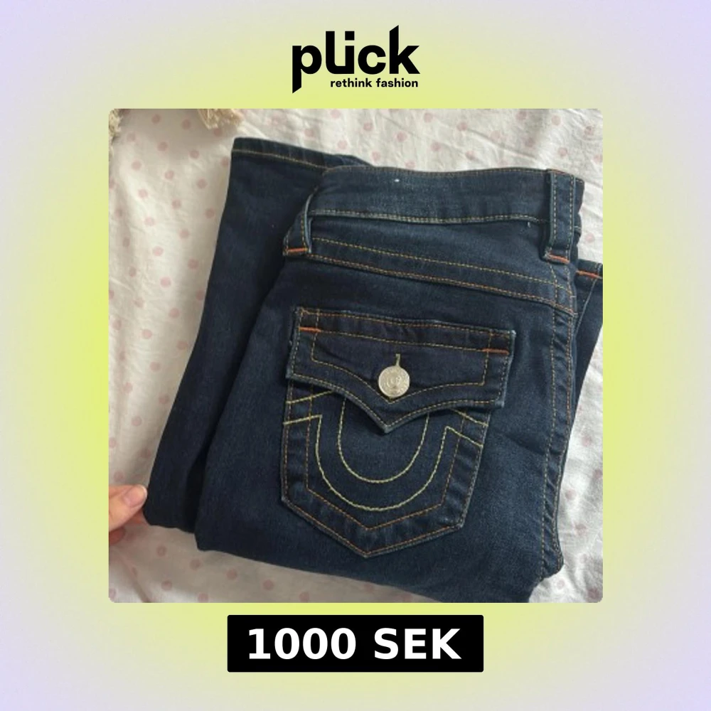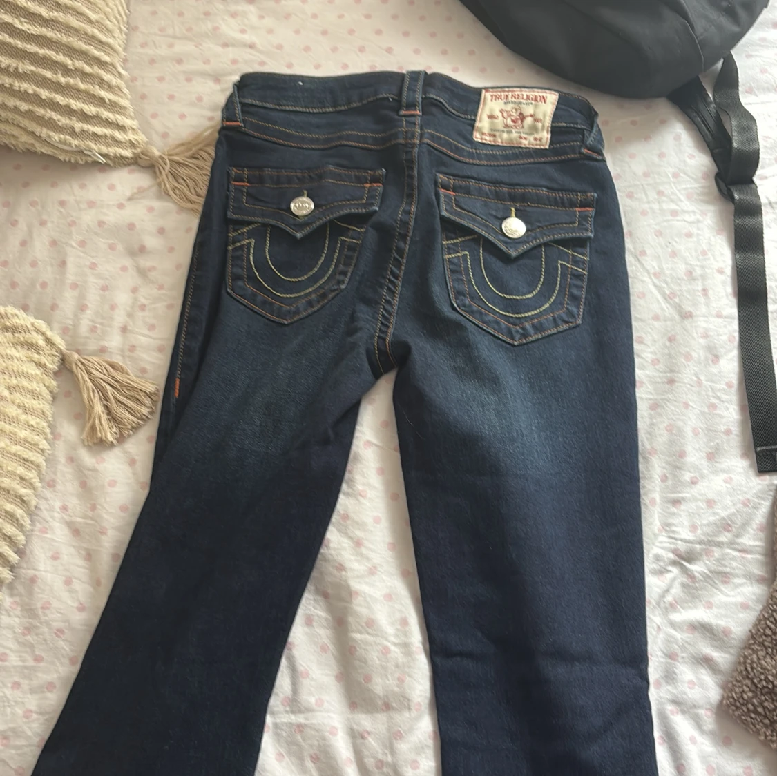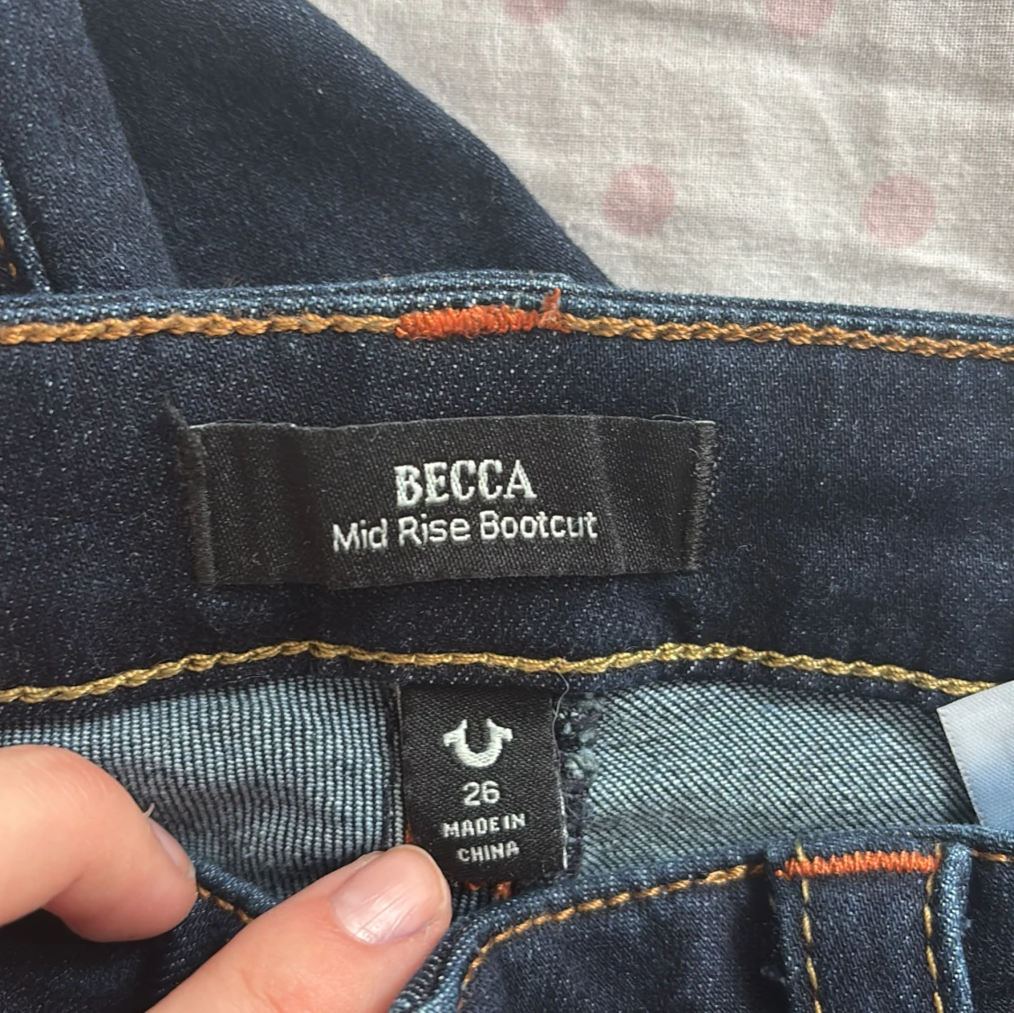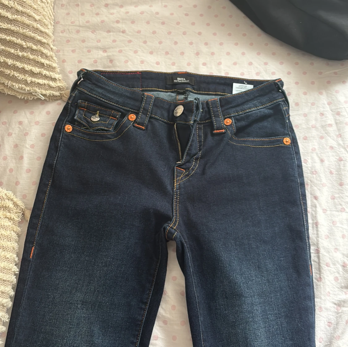 Mörkblå jeans från True Religion, modell Becca Mid Rise Bootcut. Snygga kontrastsömmar, klassiska fickor med lock och silverfärgade knappar. Bootcut-ben och mellanmidja ger en tidlös och cool look. Perfekta för dig som gillar detaljer och streetstyle. Helt oanvända köpta för 1299